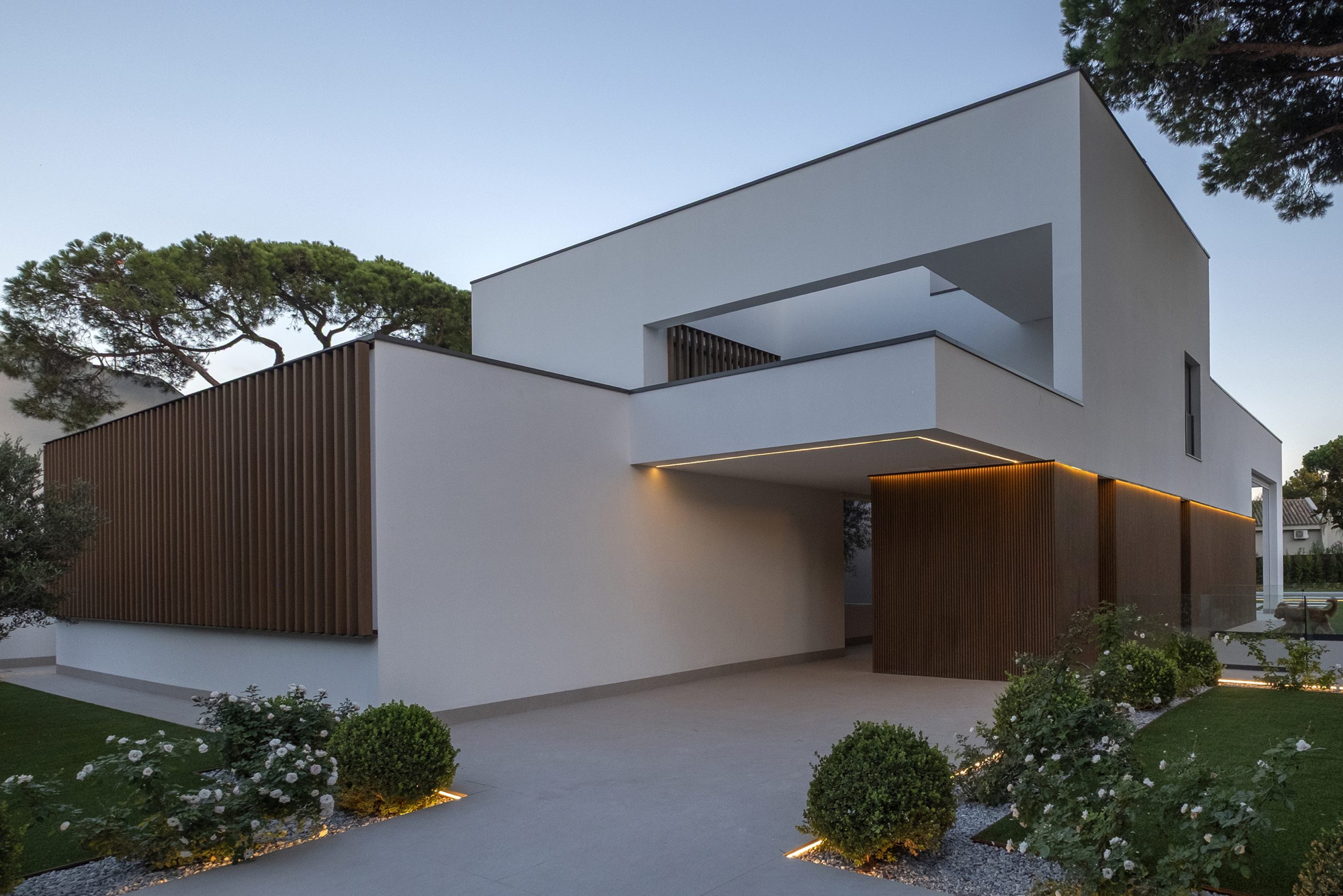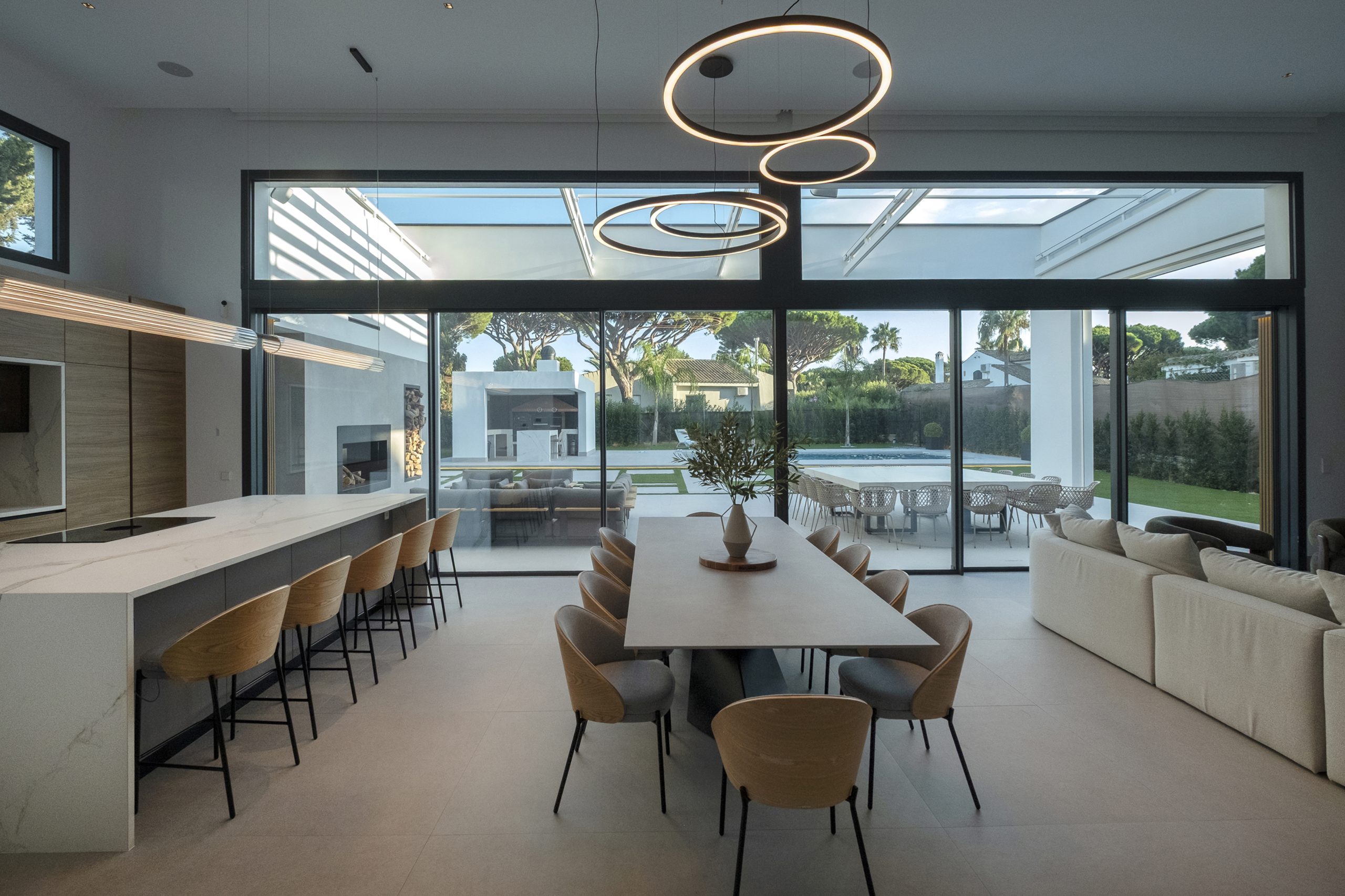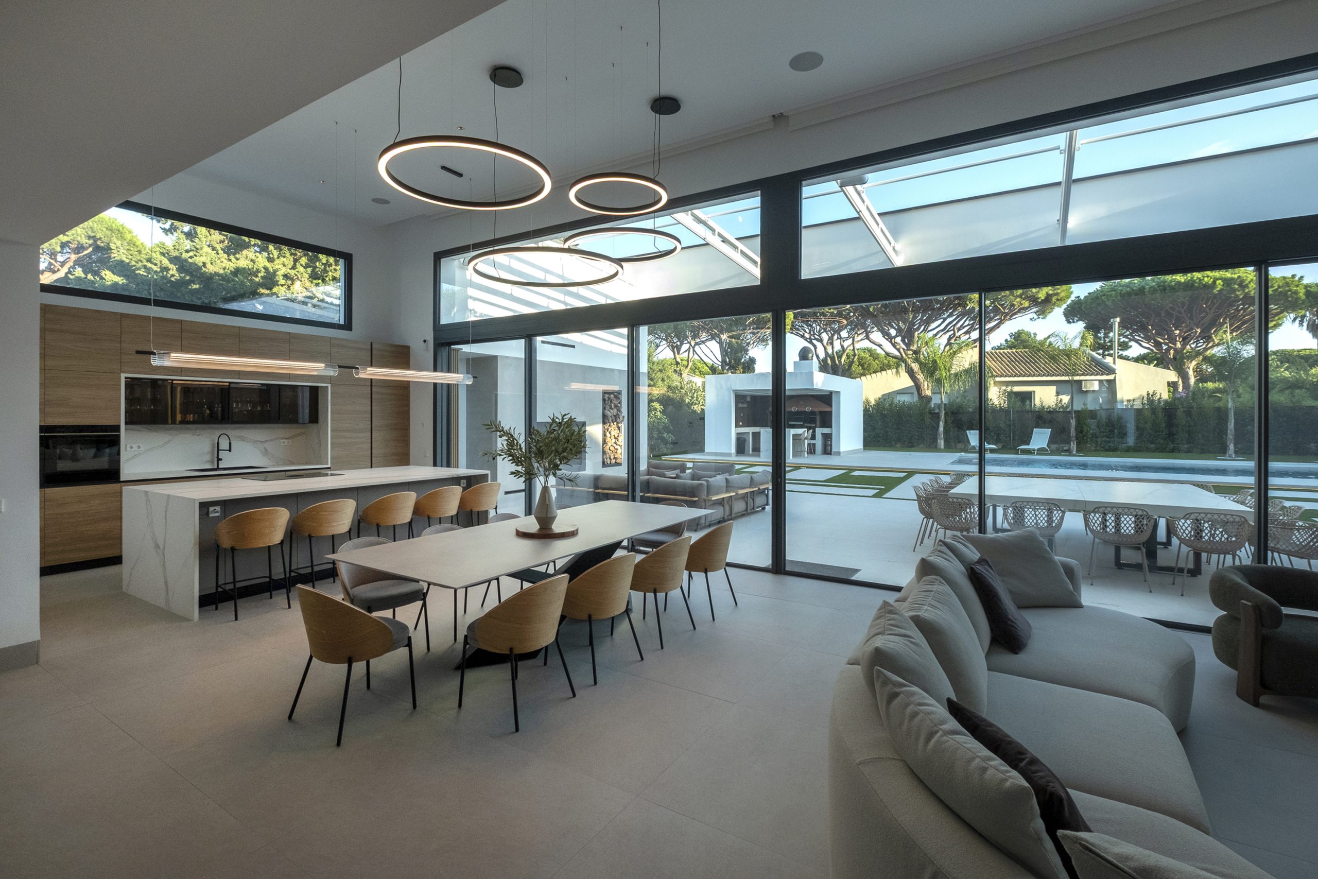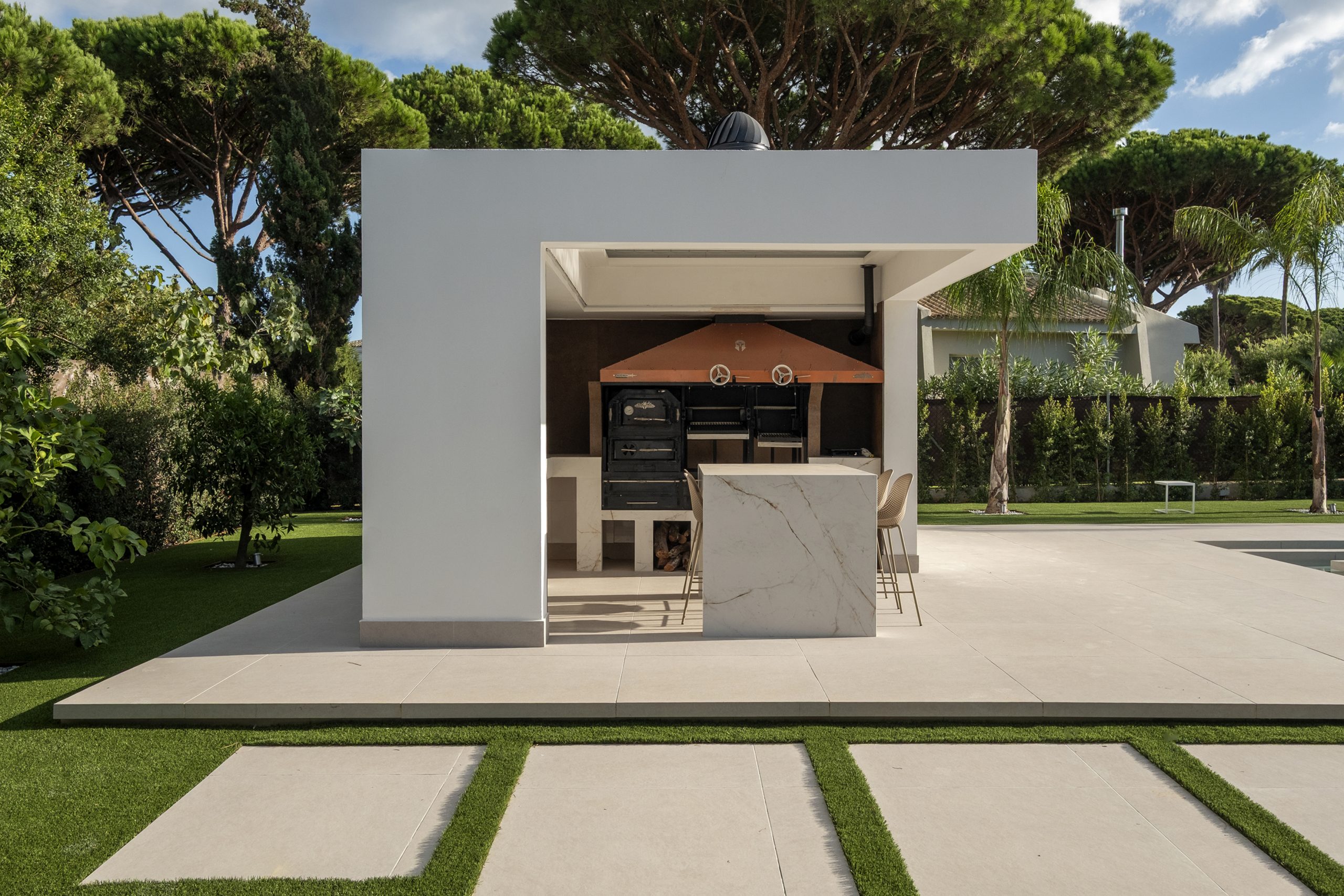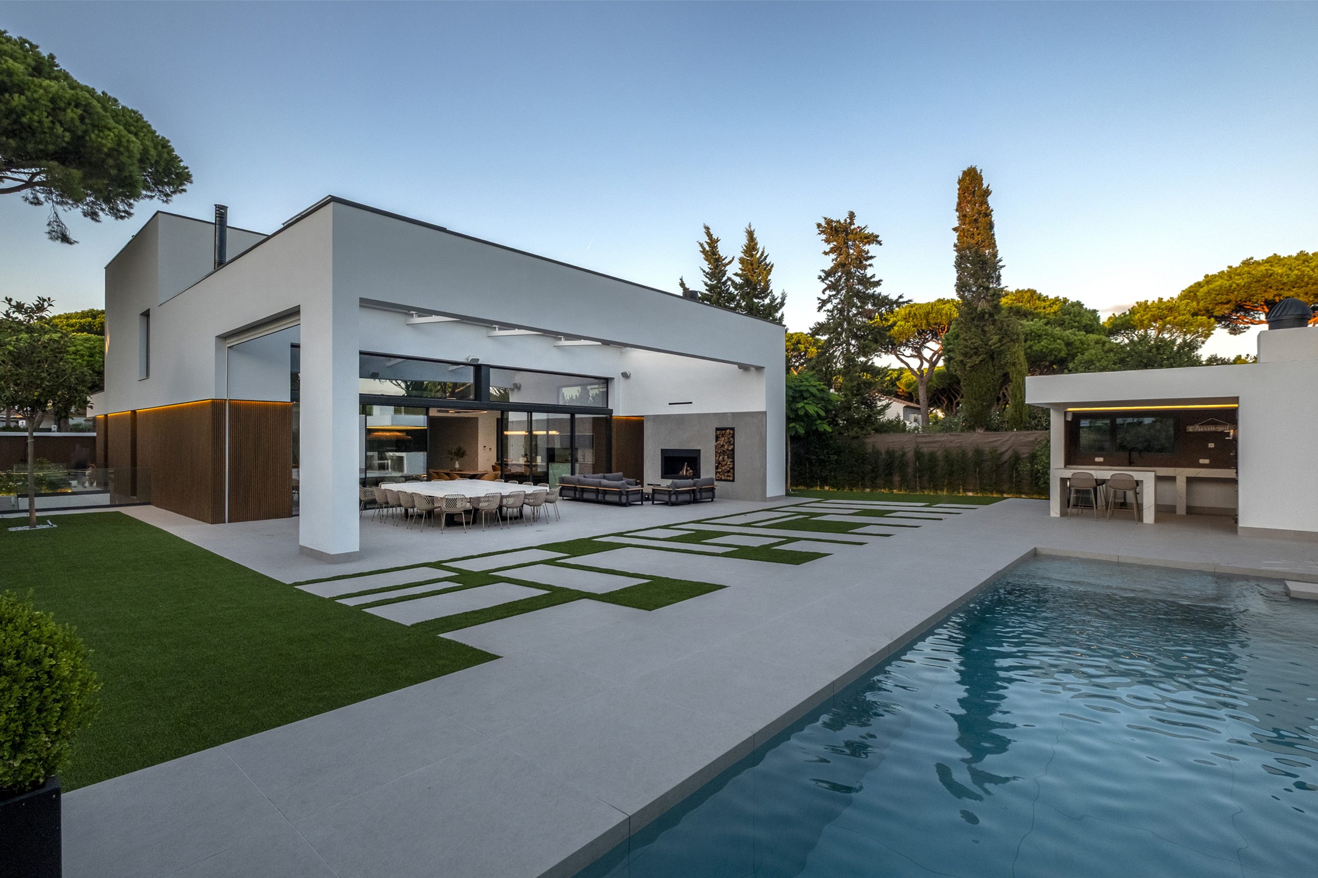 La piscina se proyecta como un gran rectángulo con amplia zona de barbacoa y barra en isla. Exteriormente, la vivienda muestra una imagen más abstracta y de volúmenes nítidos hacia la calle, y más doméstica hacia el jardín y fachadas laterales. Constructivamente, cuenta con una envolvente de baja transmitancia mediante aislamiento térmico exterior, cubierta invertida y vidrios bajo emisivos; junto con un sistema de ventilación con recuperación de calor, logra una demanda energética casi nula.
