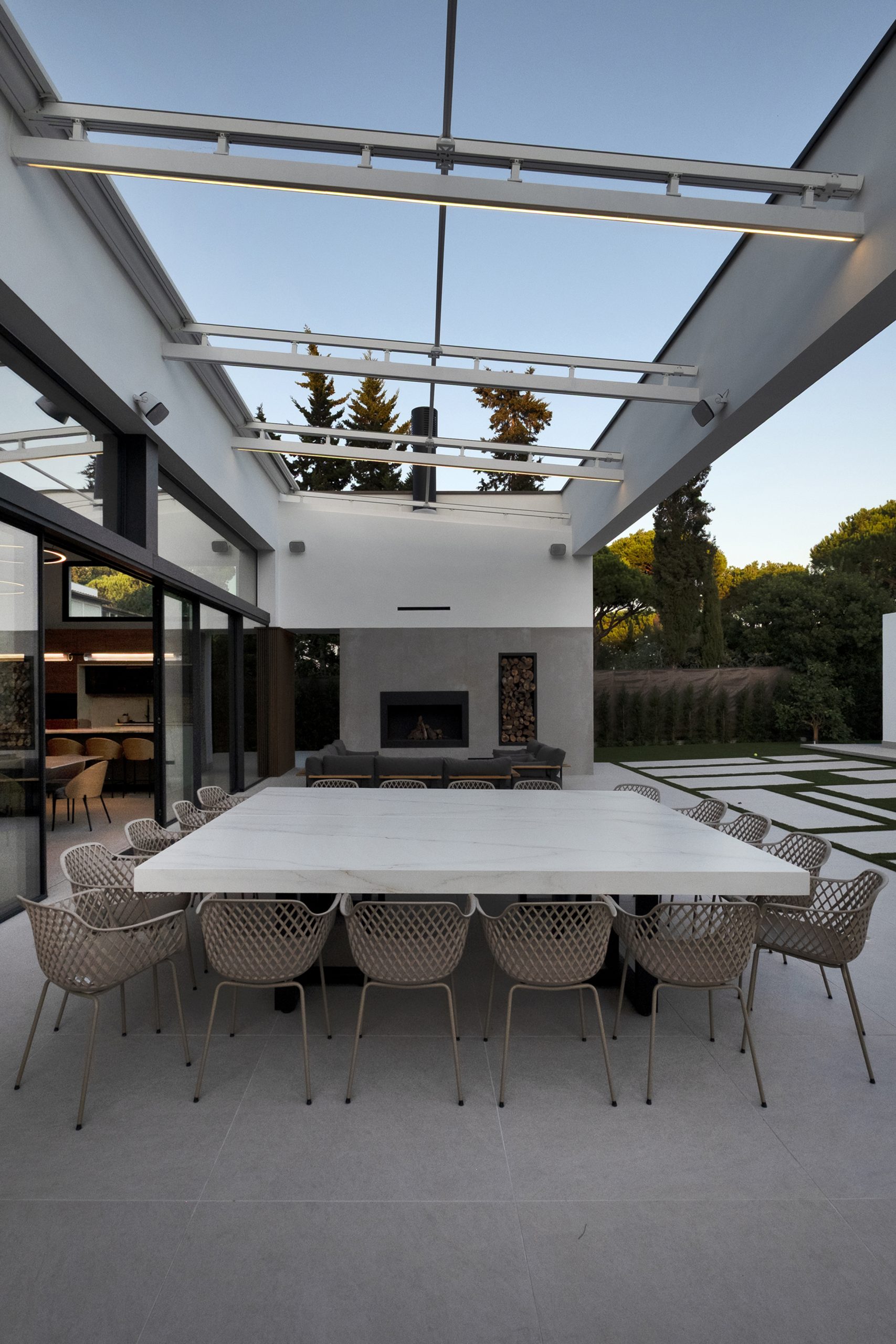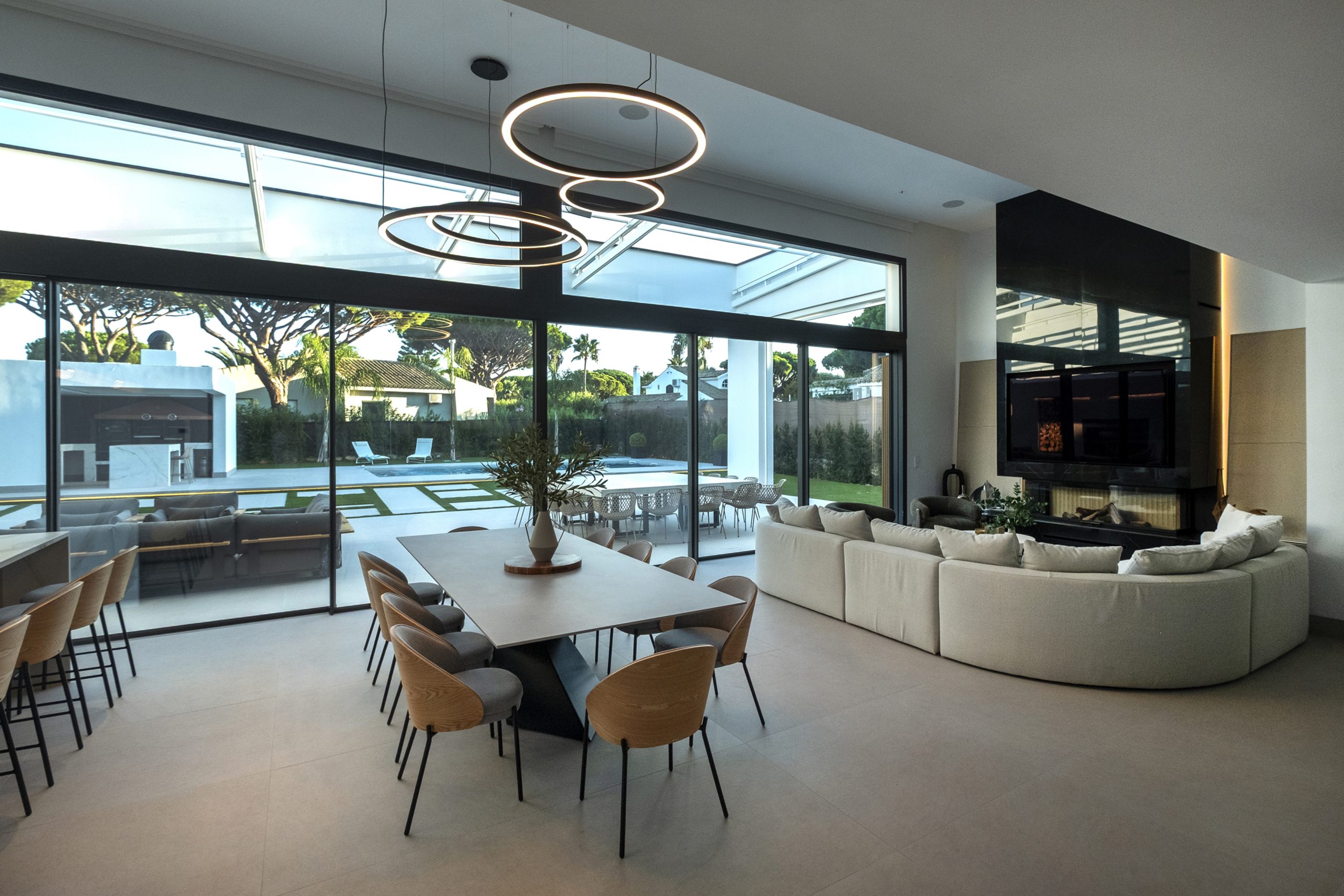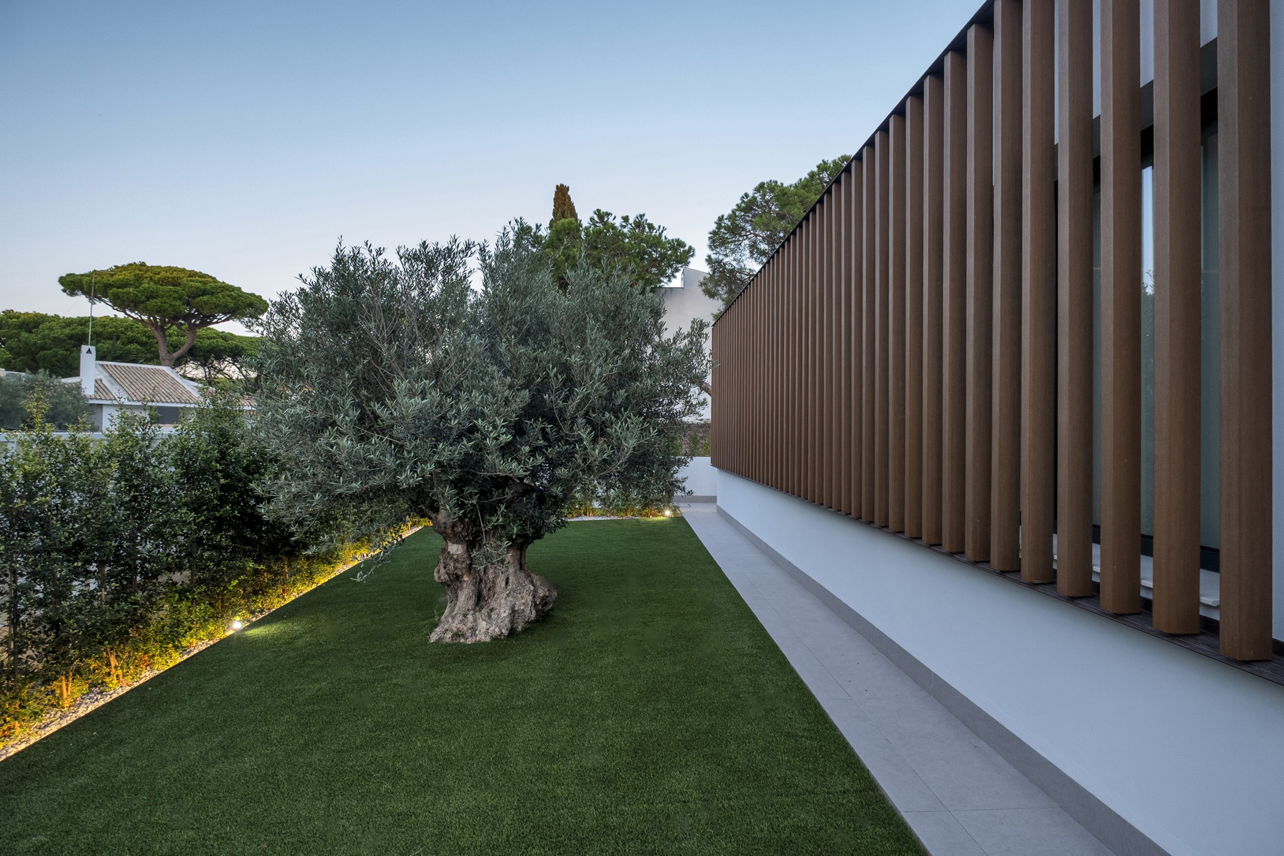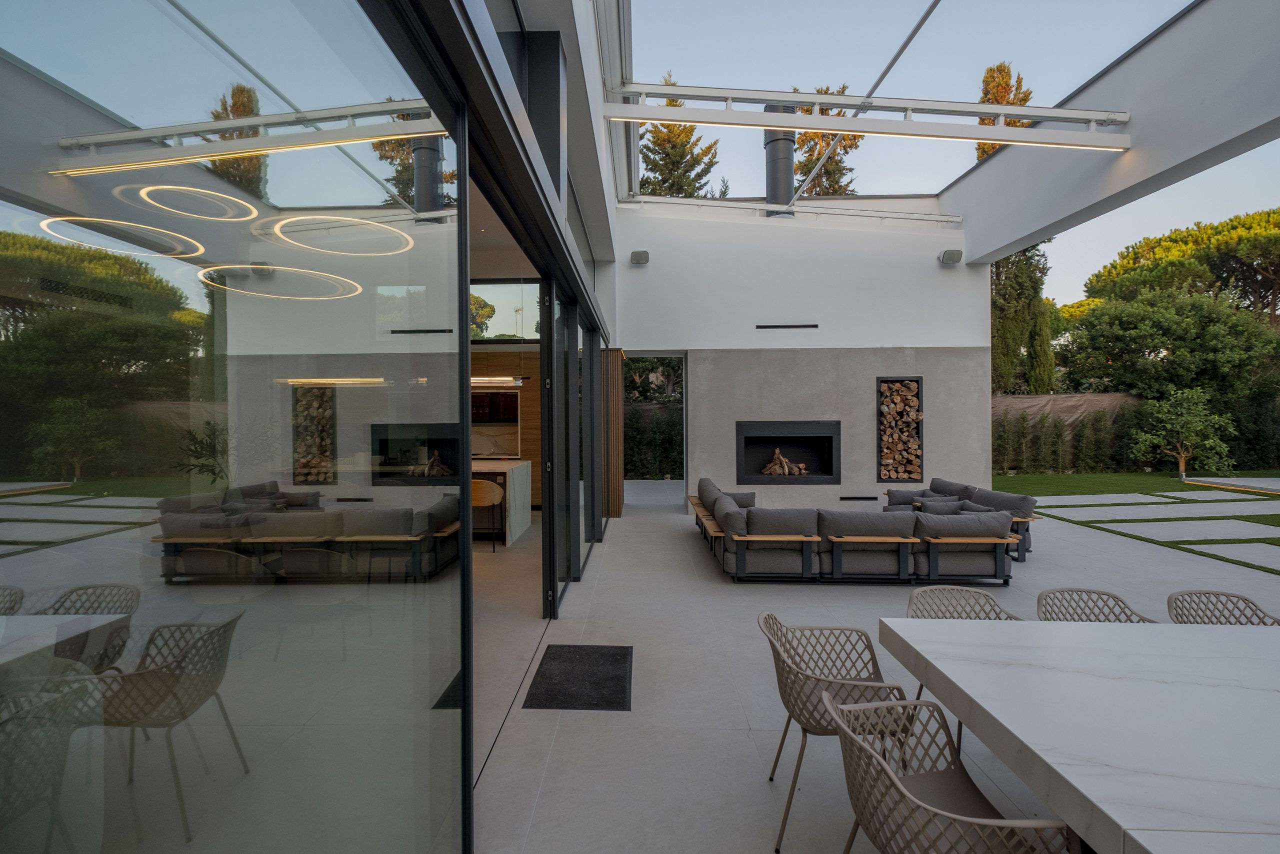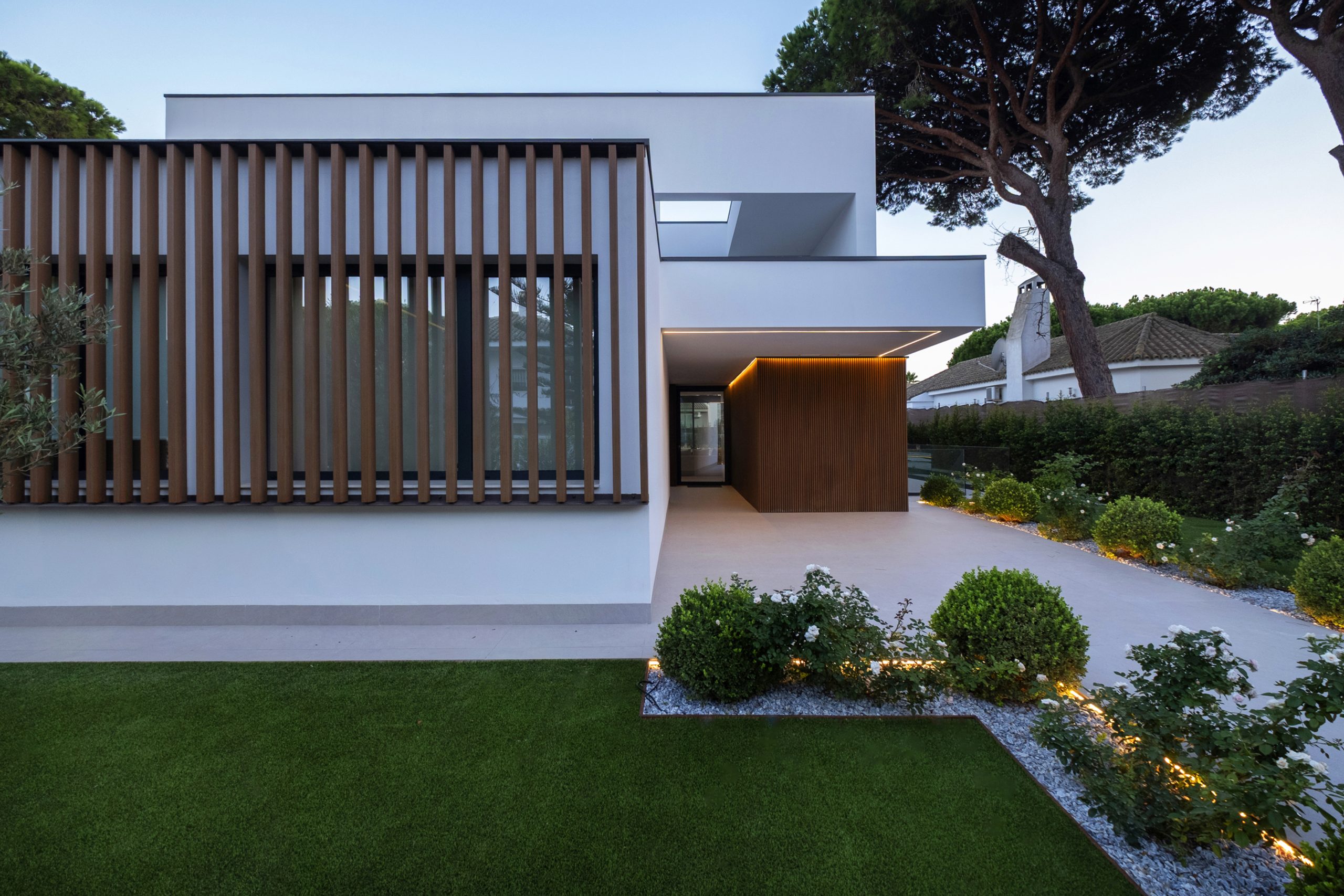 La piscina se proyecta como un gran rectángulo con amplia zona de barbacoa y barra en isla. Exteriormente, la vivienda muestra una imagen más abstracta y de volúmenes nítidos hacia la calle, y más doméstica hacia el jardín y fachadas laterales. Constructivamente, cuenta con una envolvente de baja transmitancia mediante aislamiento térmico exterior, cubierta invertida y vidrios bajo emisivos; junto con un sistema de ventilación con recuperación de calor, logra una demanda energética casi nula.