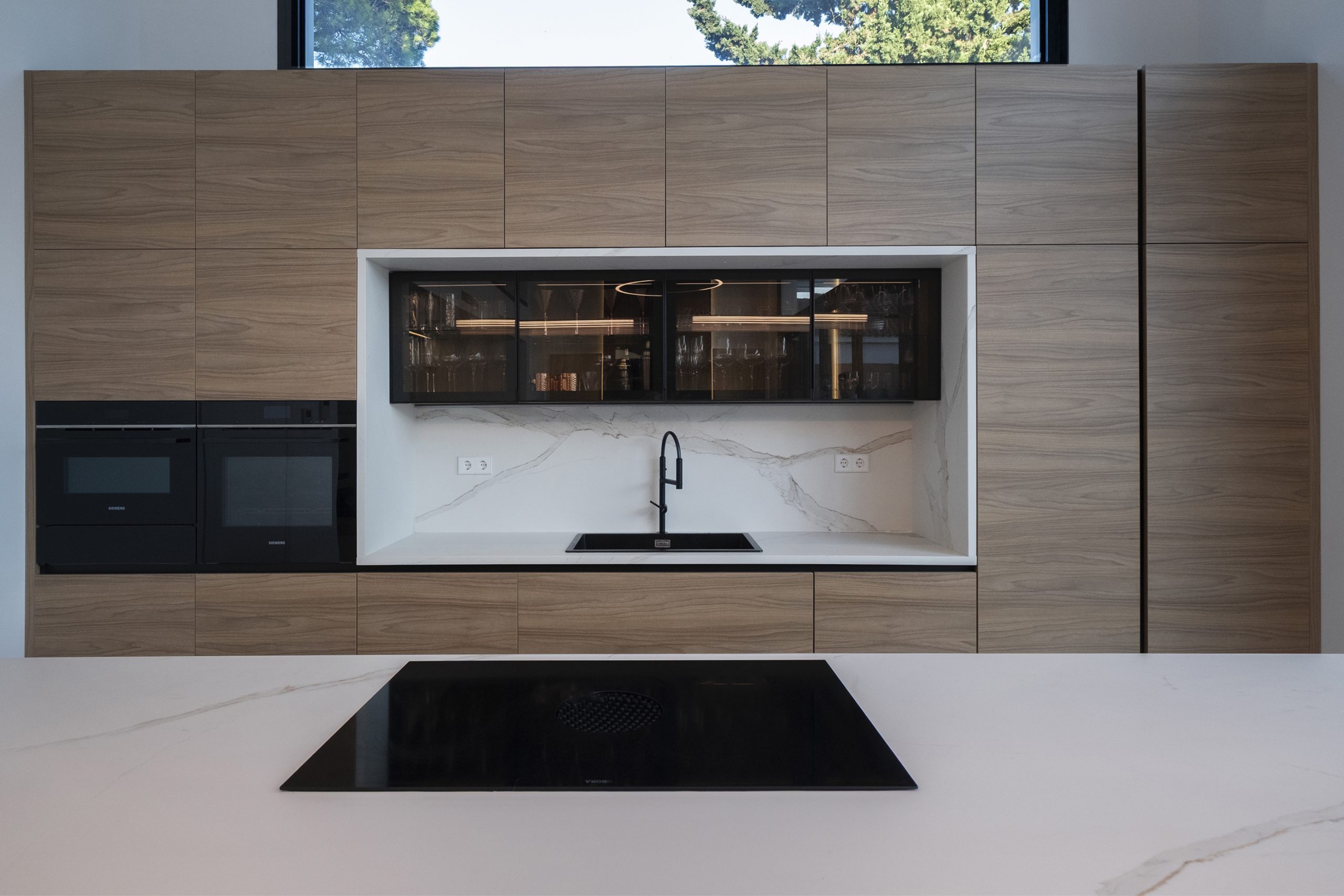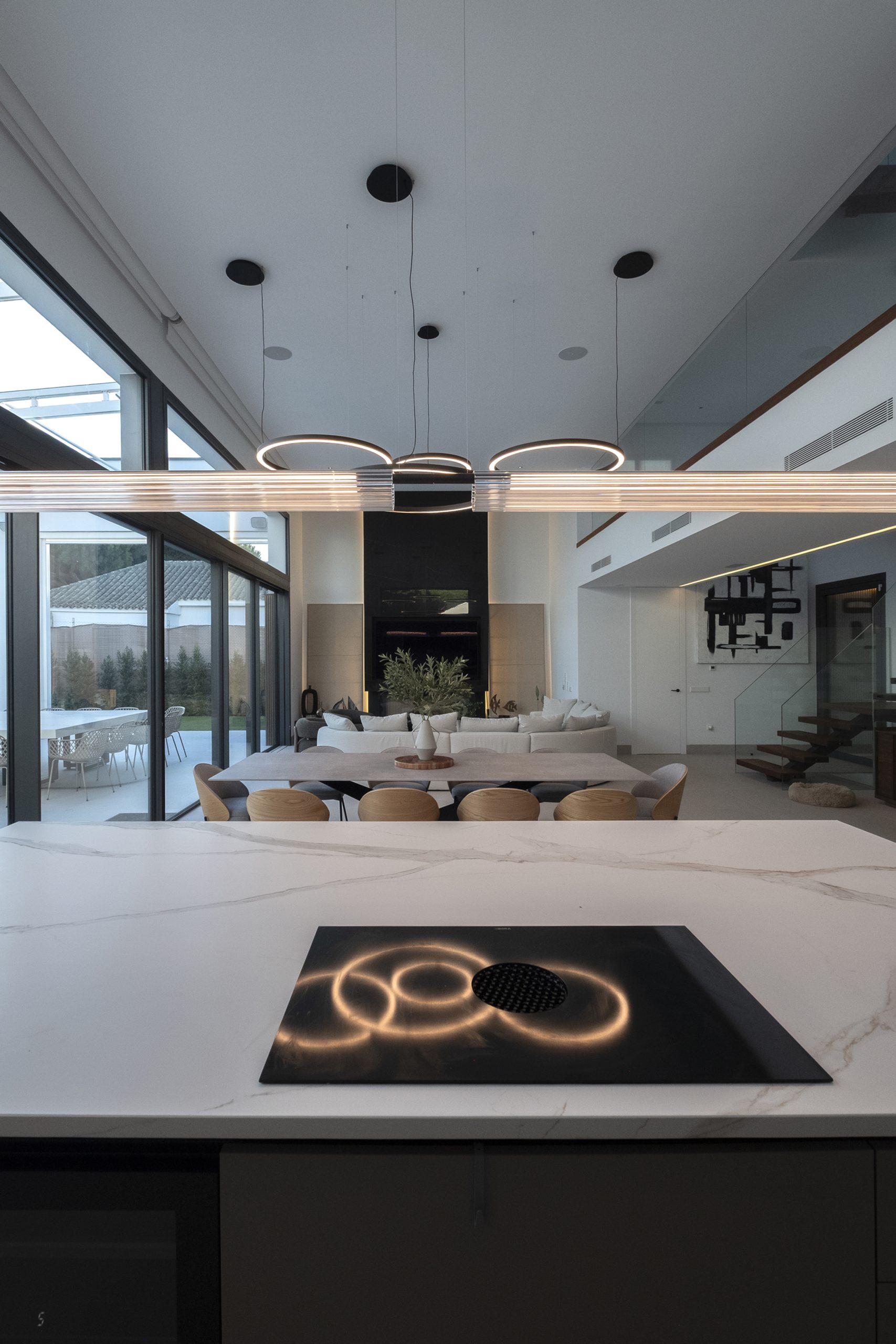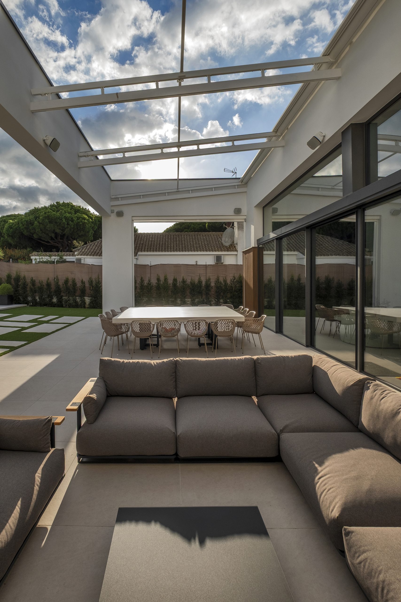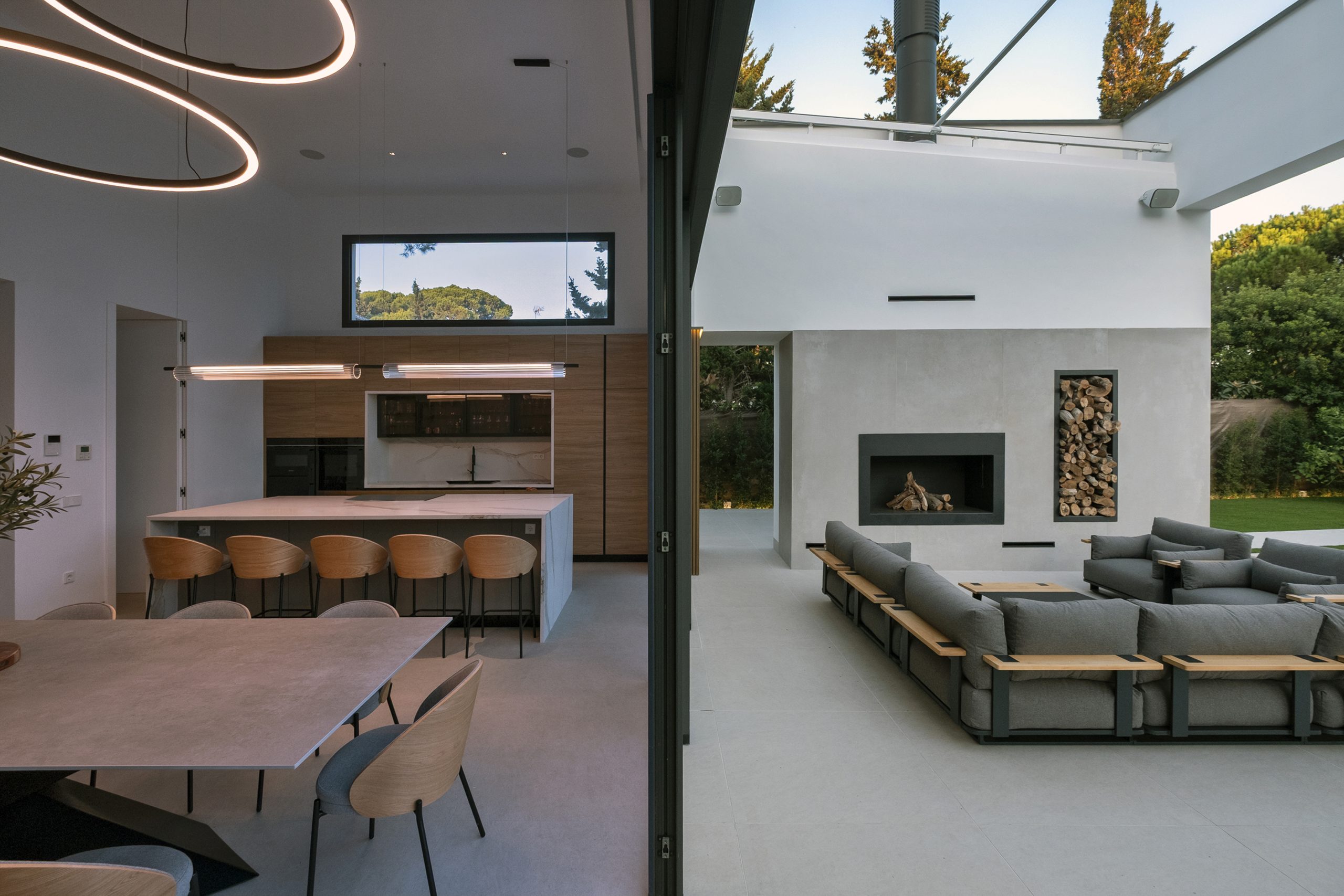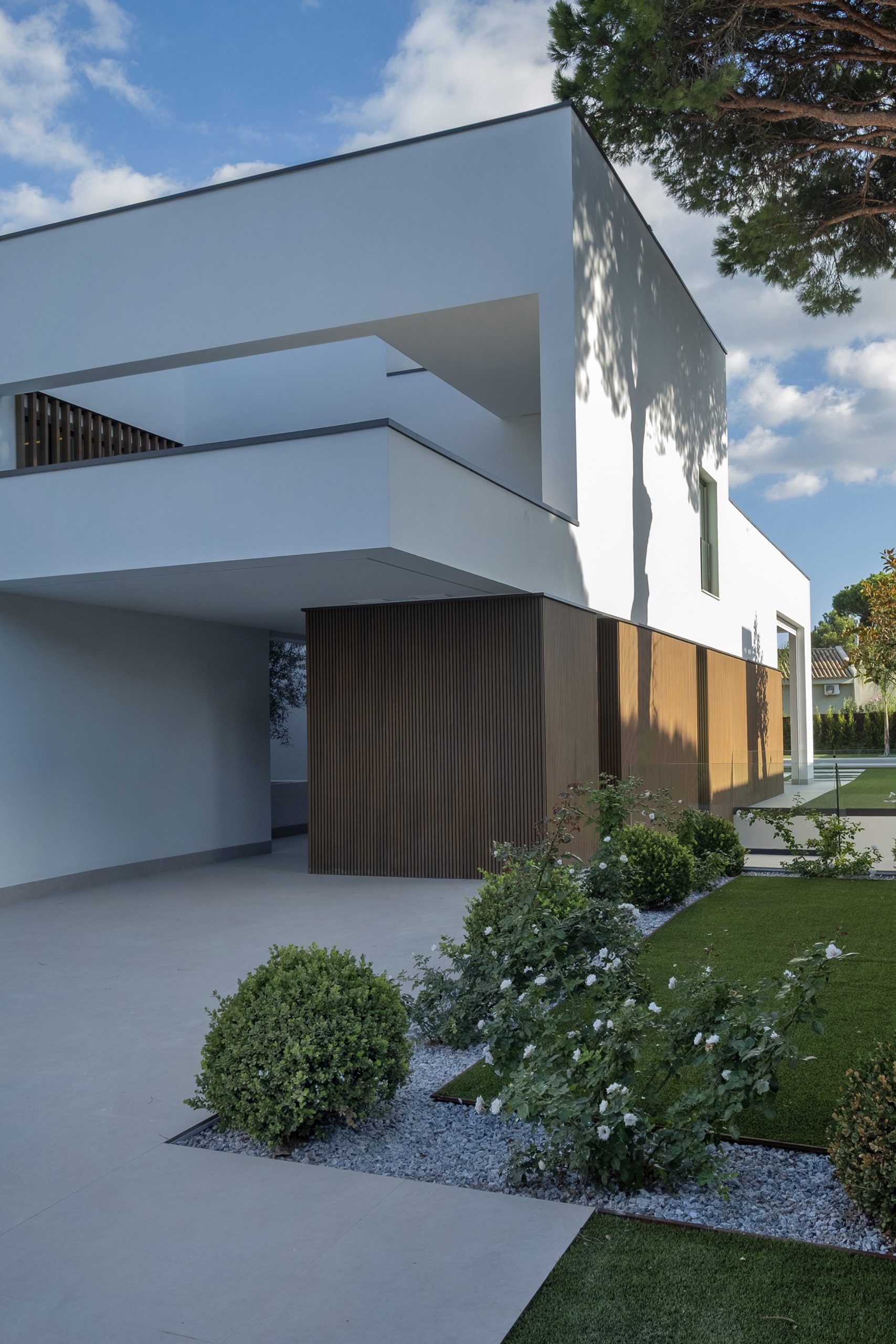 La piscina se proyecta como un gran rectángulo con amplia zona de barbacoa y barra en isla. Exteriormente, la vivienda muestra una imagen más abstracta y de volúmenes nítidos hacia la calle, y más doméstica hacia el jardín y fachadas laterales. Constructivamente, cuenta con una envolvente de baja transmitancia mediante aislamiento térmico exterior, cubierta invertida y vidrios bajo emisivos; junto con un sistema de ventilación con recuperación de calor, logra una demanda energética casi nula.