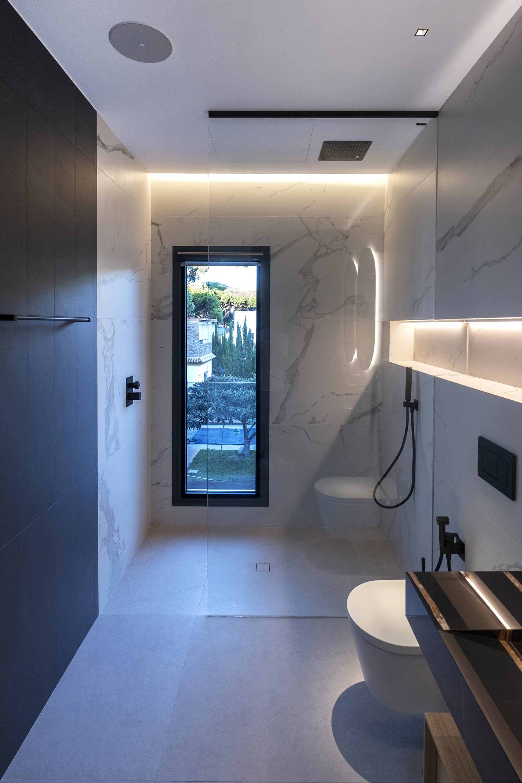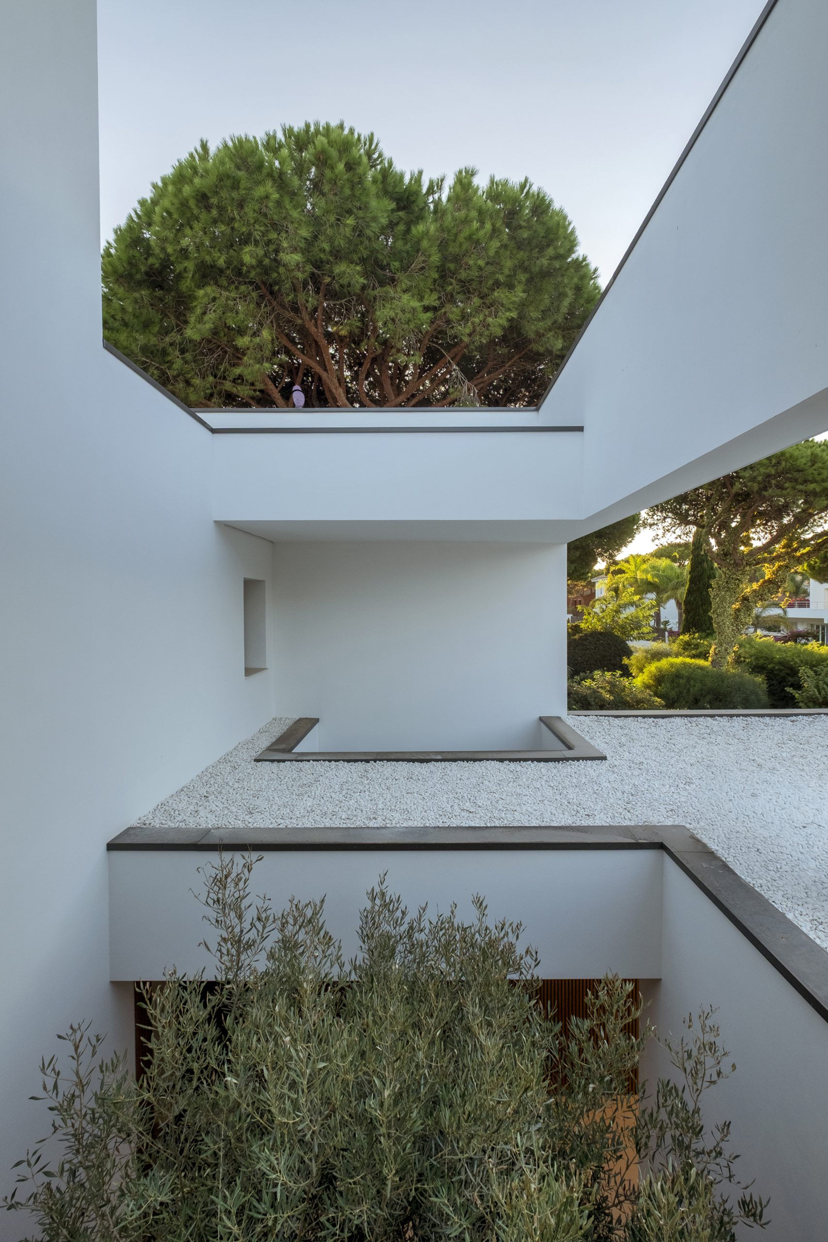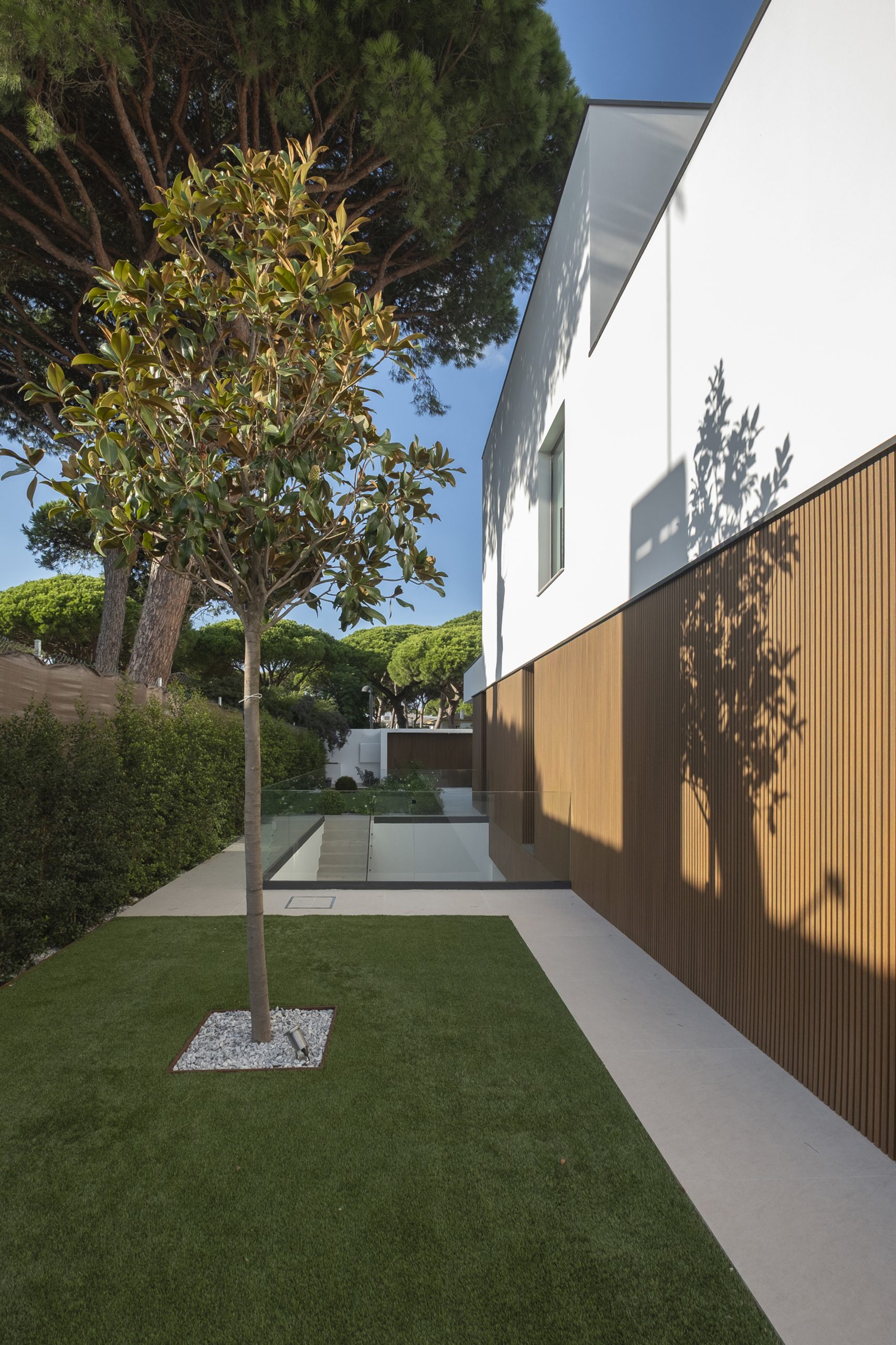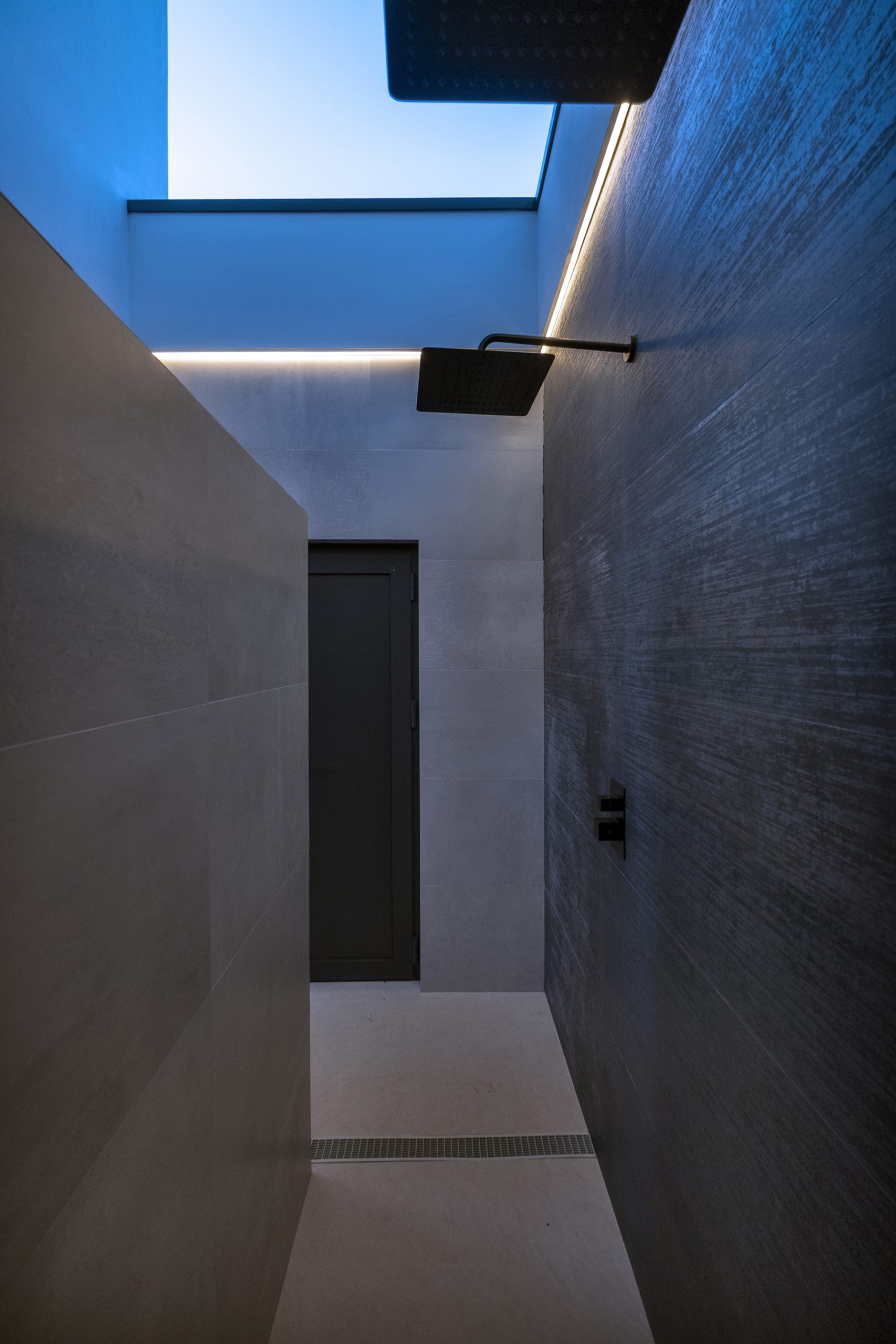 En el acceso lateral se sitúa una ducha exterior abierta pero cubierta, a doble altura y con vistas diagonales al cielo y al patio. En el sótano, el gimnasio se ilumina y ventila mediante un patio inglés, con el garaje en el extremo opuesto.