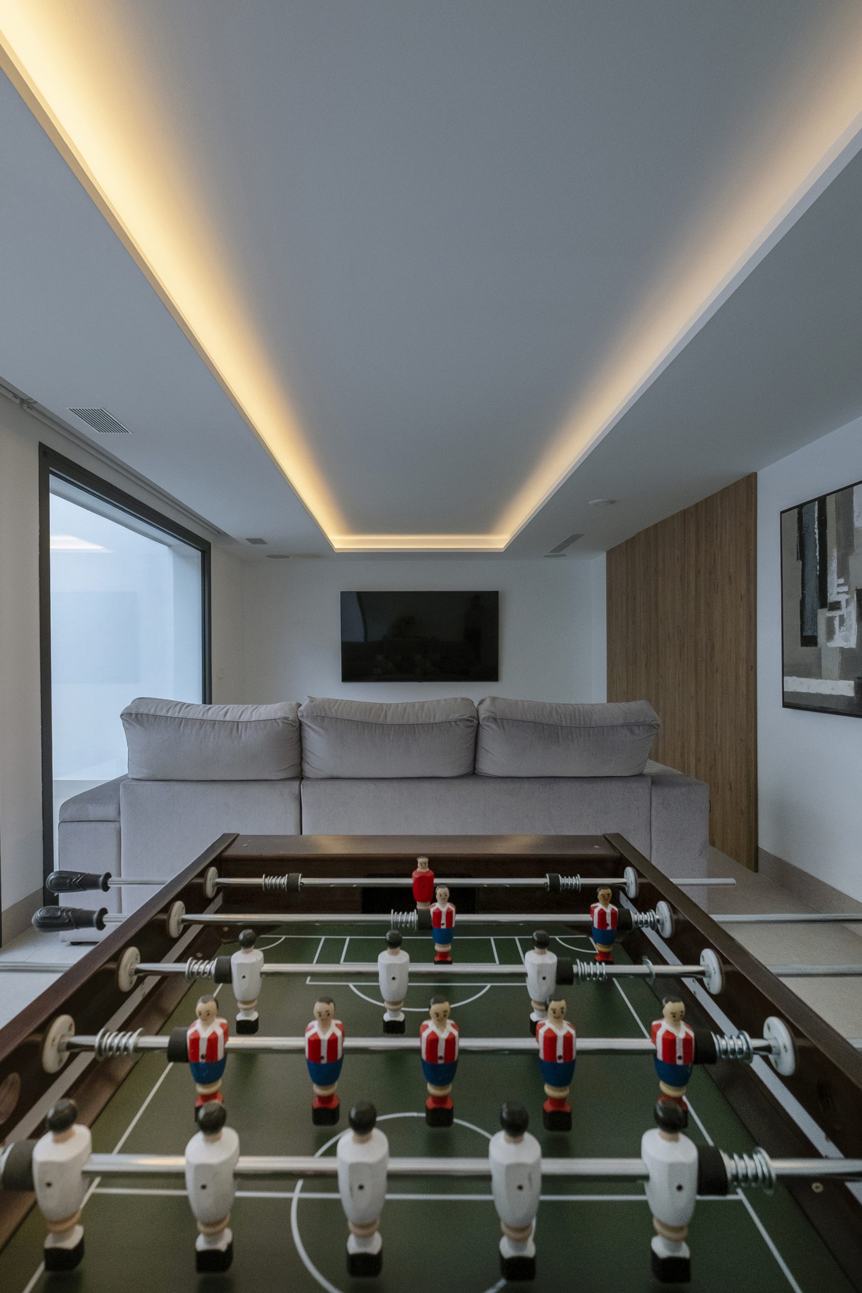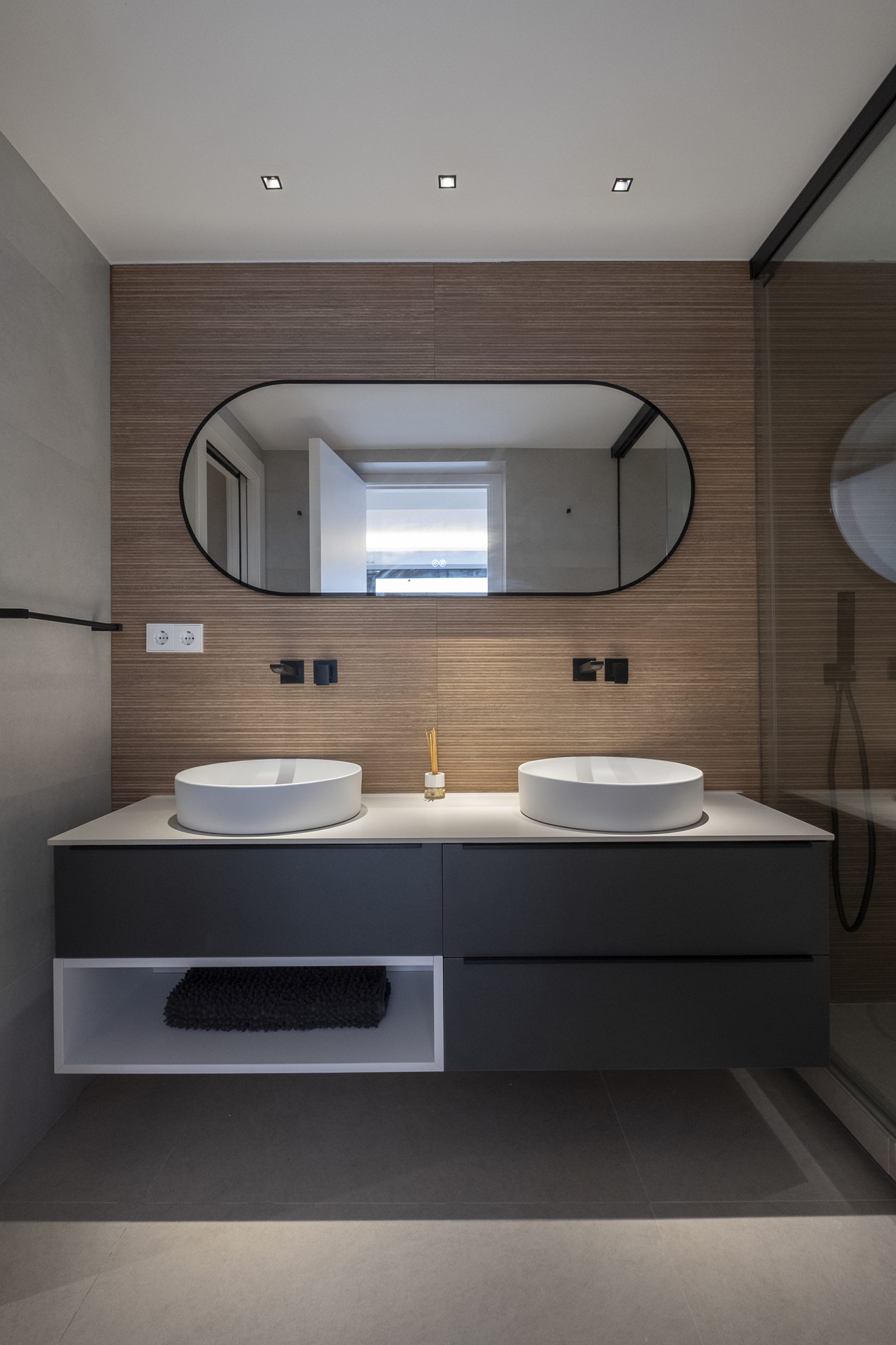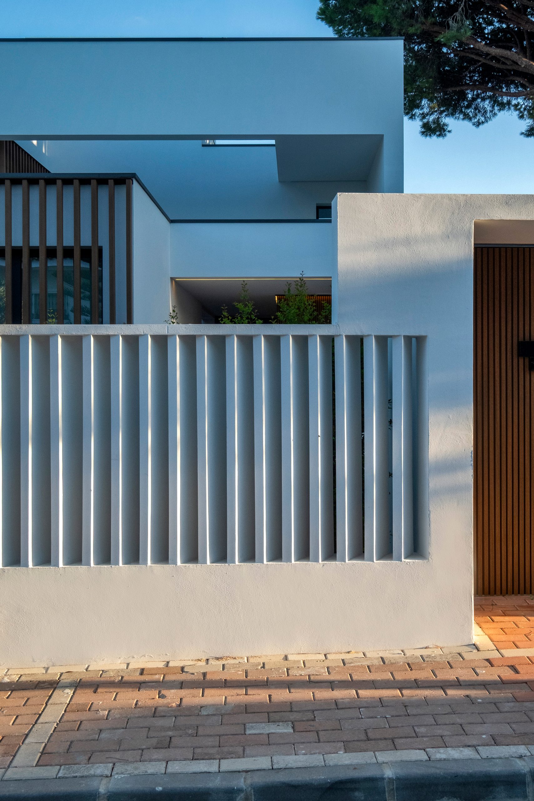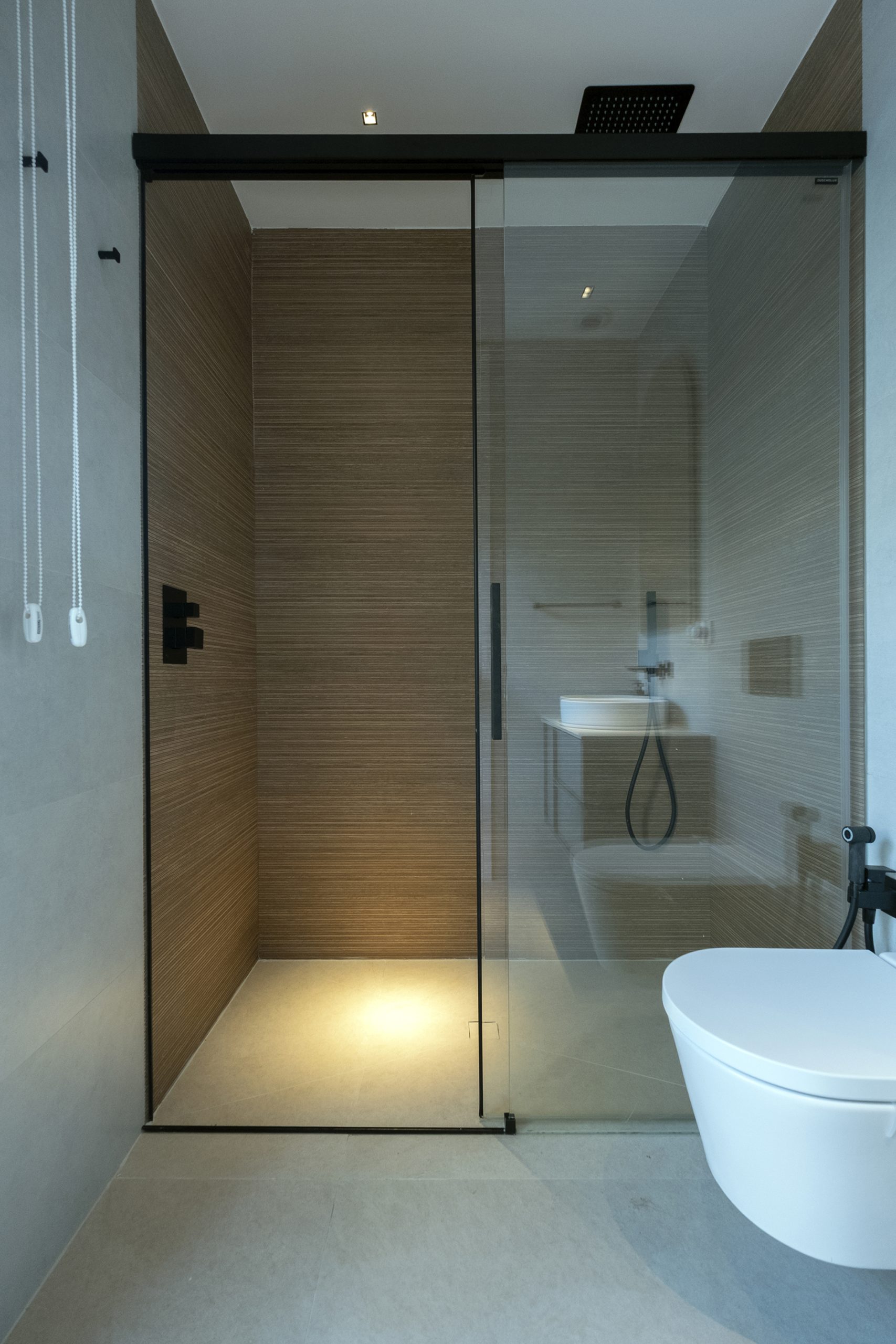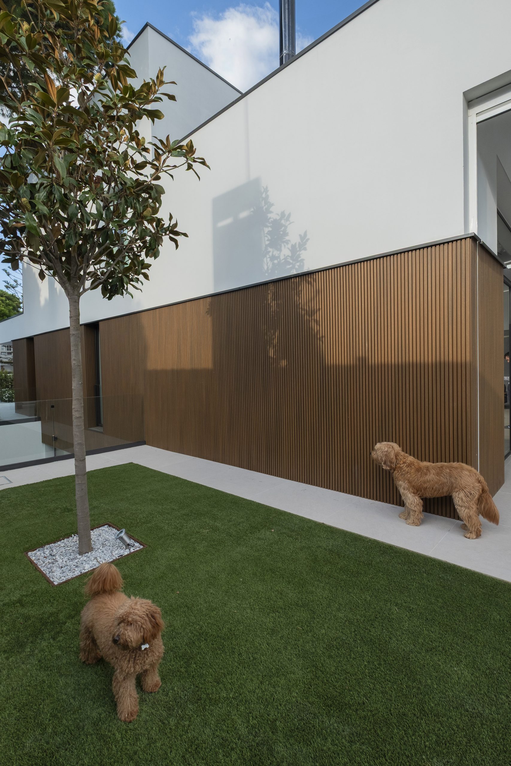 En el acceso lateral se sitúa una ducha exterior abierta pero cubierta, a doble altura y con vistas diagonales al cielo y al patio. En el sótano, el gimnasio se ilumina y ventila mediante un patio inglés, con el garaje en el extremo opuesto.