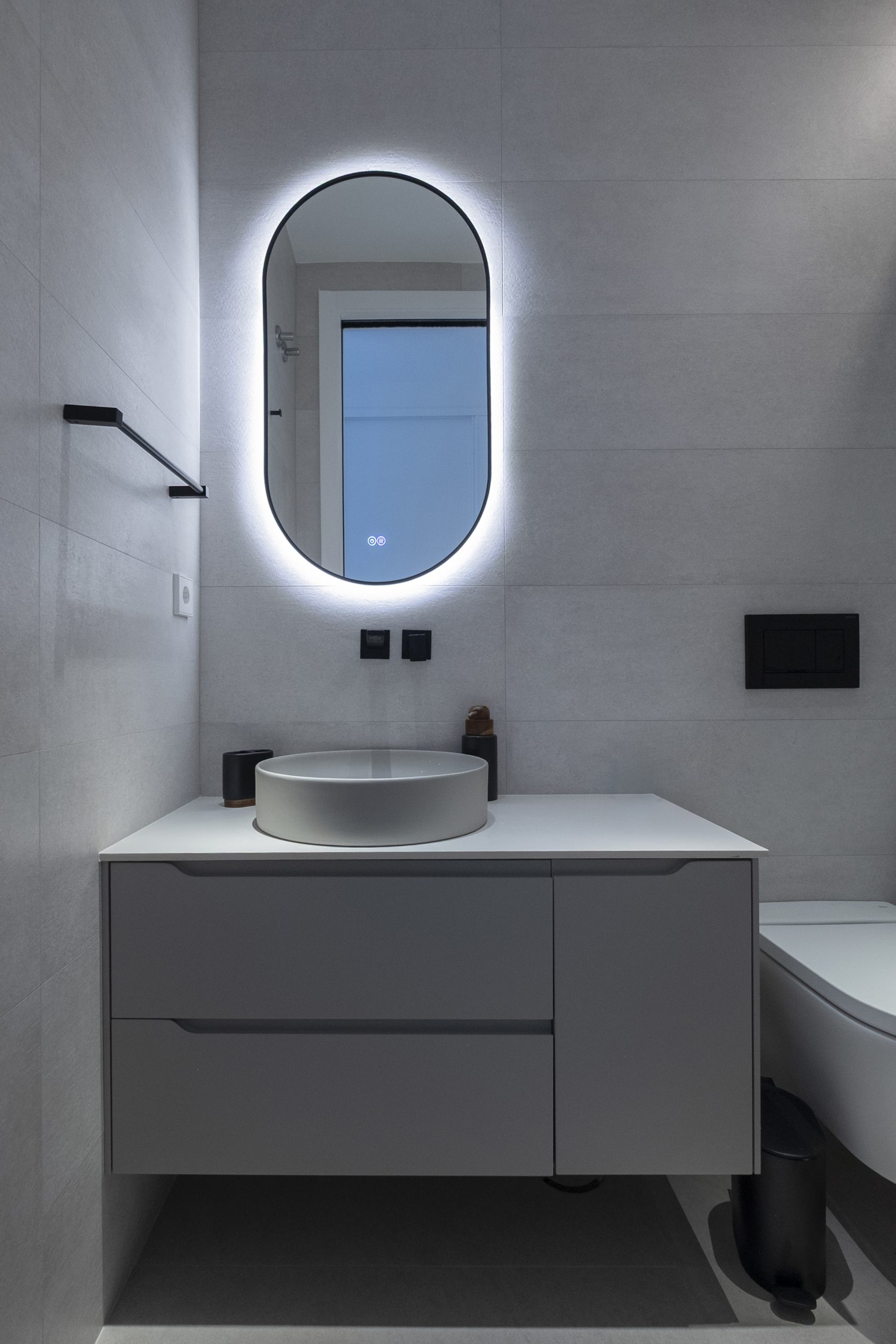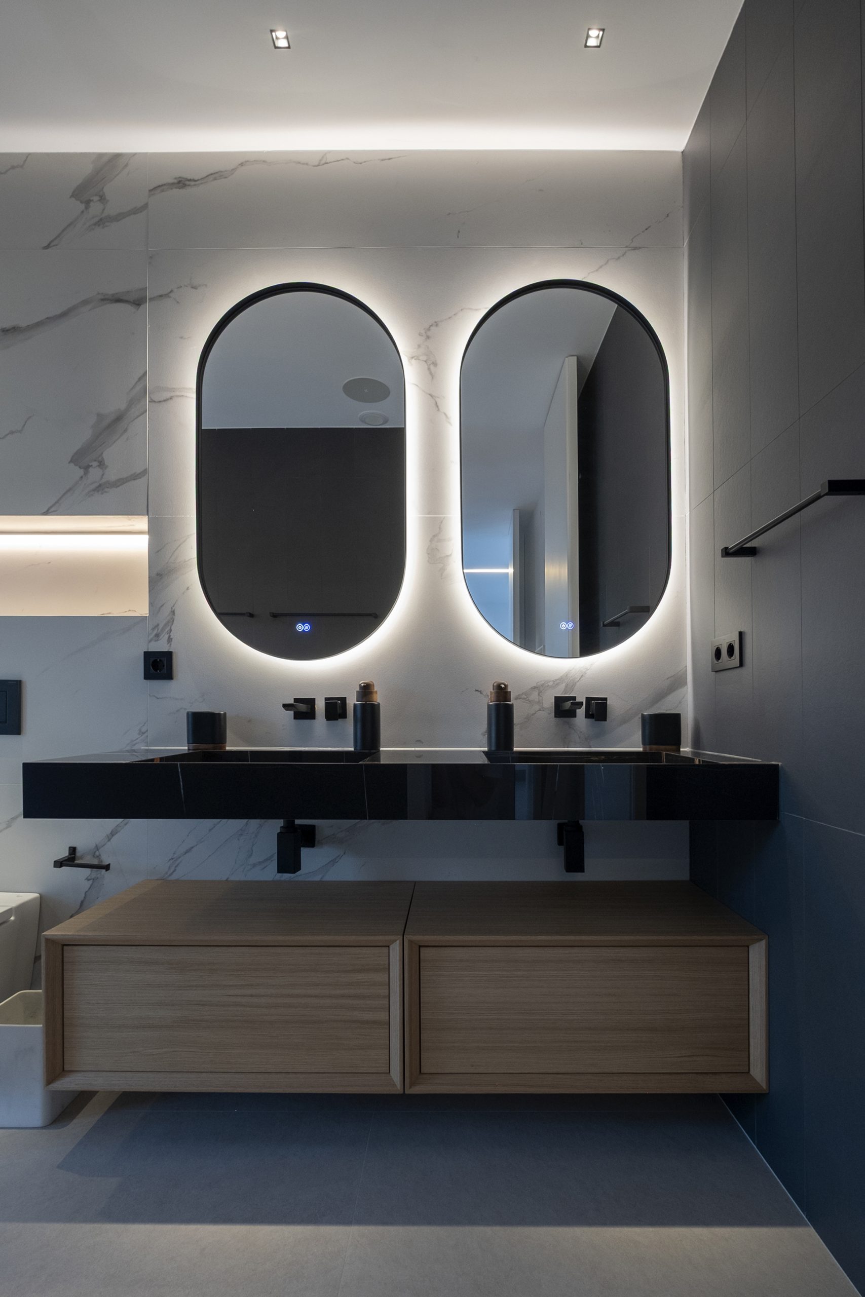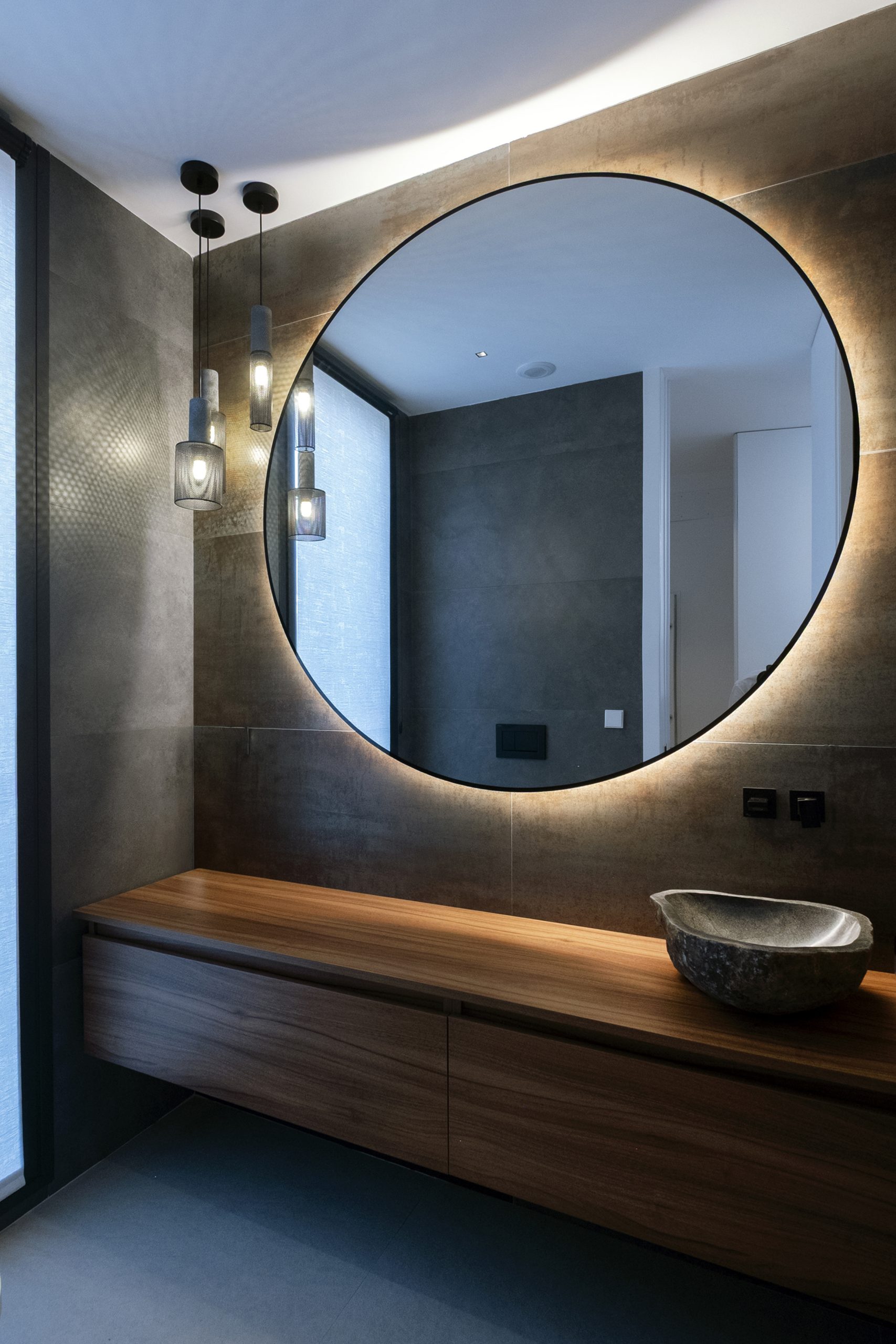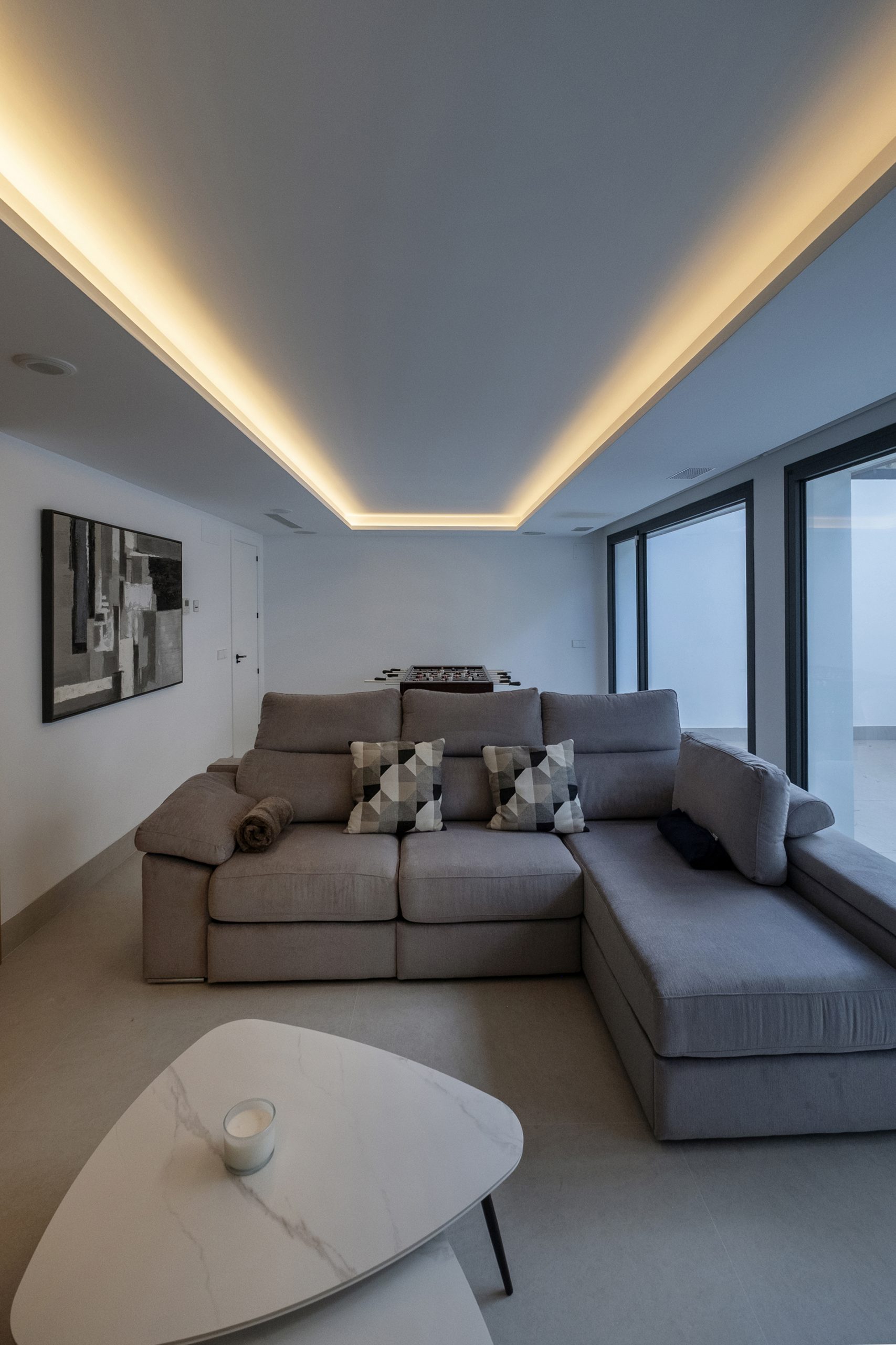 En el acceso lateral se sitúa una ducha exterior abierta pero cubierta, a doble altura y con vistas diagonales al cielo y al patio. En el sótano, el gimnasio se ilumina y ventila mediante un patio inglés, con el garaje en el extremo opuesto.