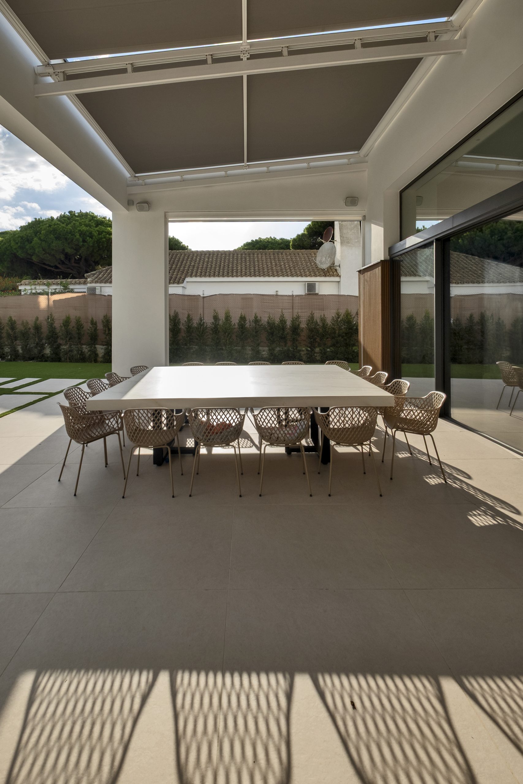 El porche, a doble altura y entoldado, está diseñado para permitir la entrada de radiación solar al salón en invierno y su protección en verano mediante sistemas de sombra, haciendo que el salón funcione como captador solar pasivo y mejore el comportamiento térmico de la vivienda.