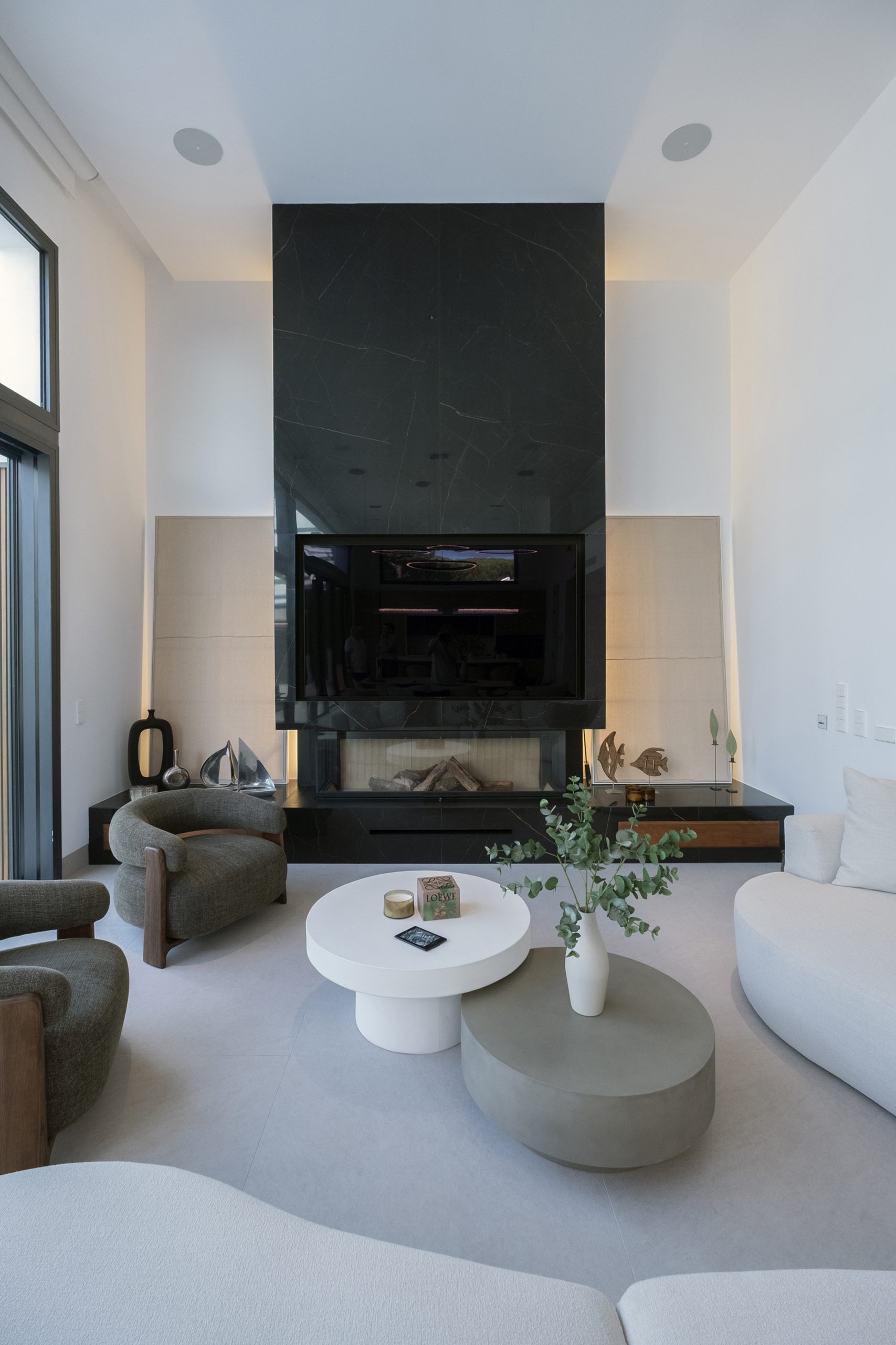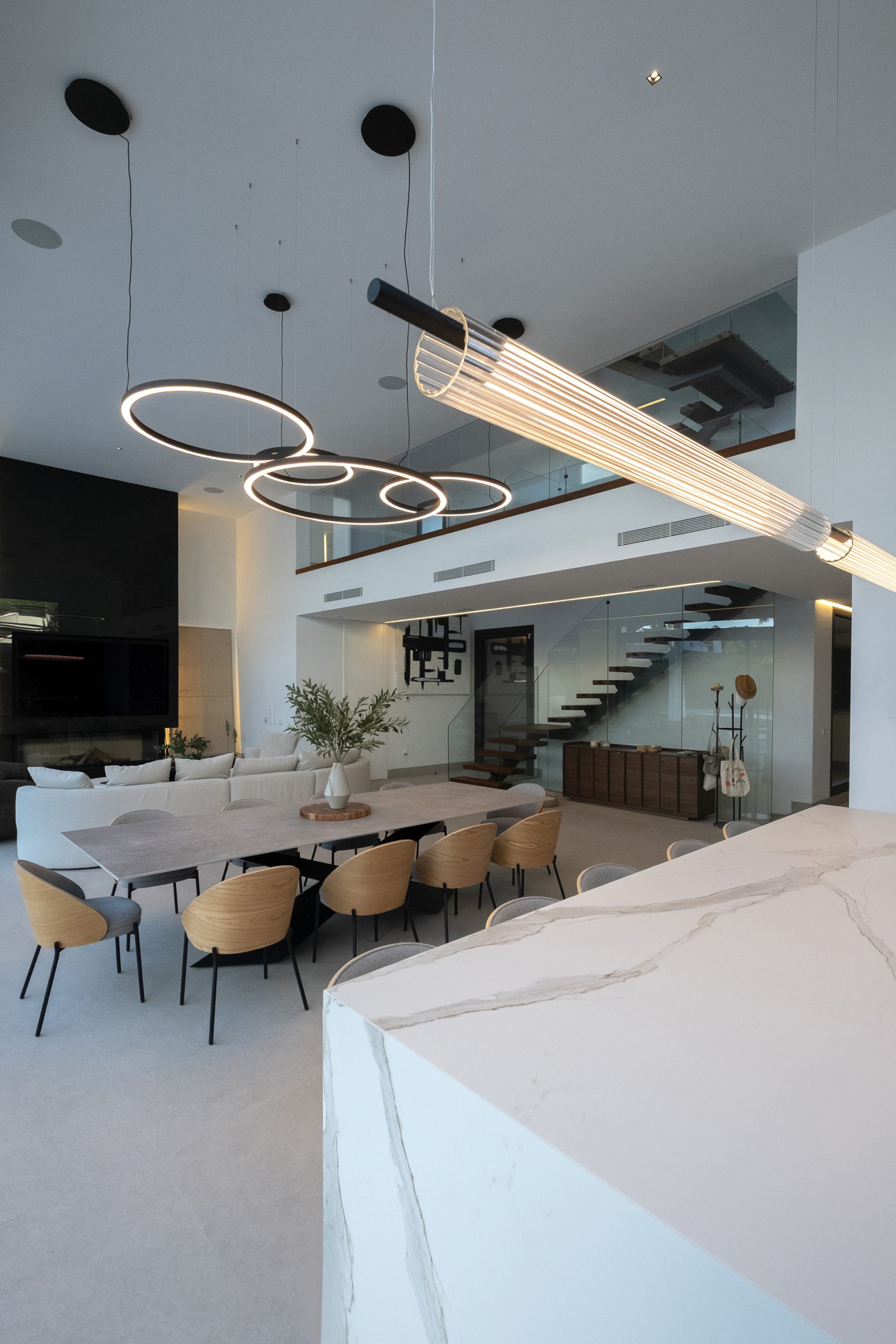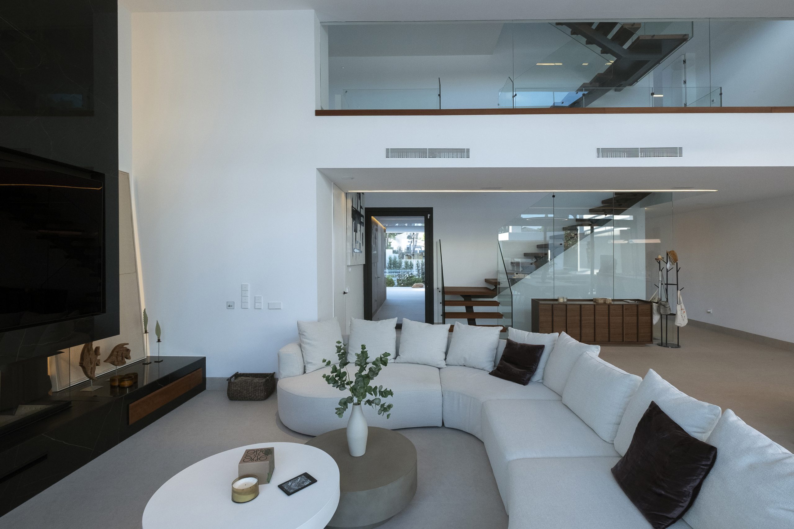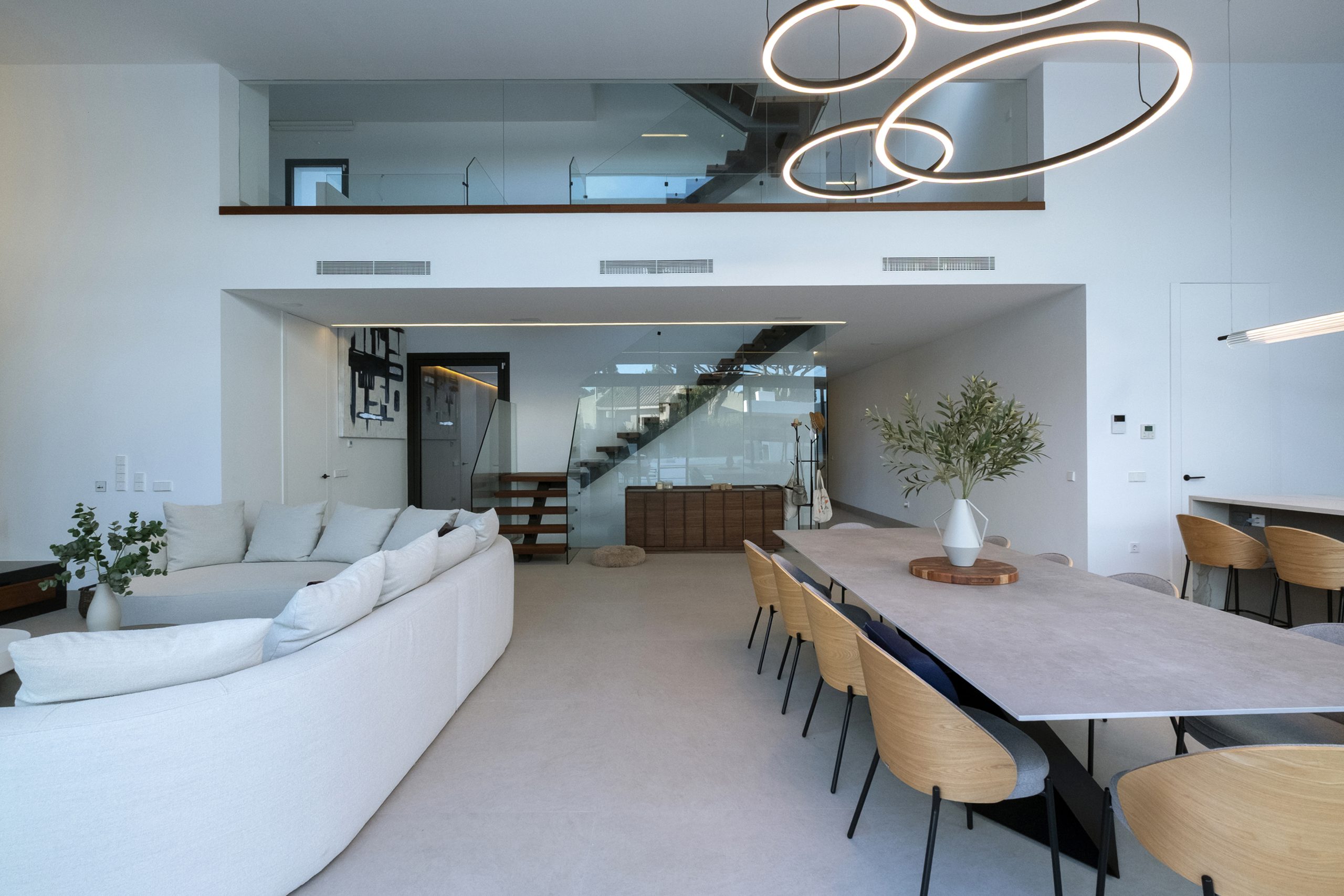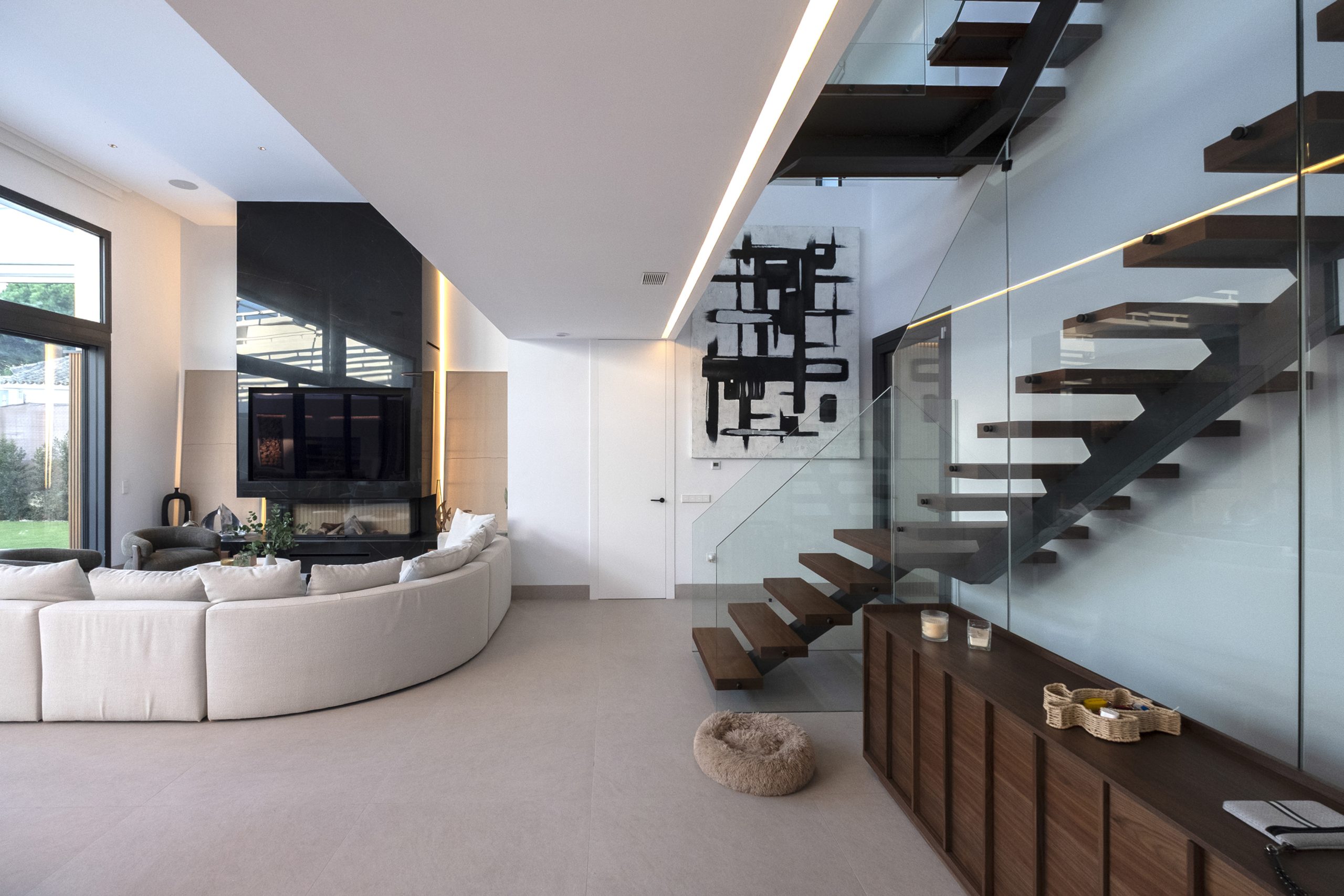 La planta baja se organiza en dos ámbitos diferenciados. Por un lado, la zona de días se dispone a lo largo de todo el frente orientado al jardín, relacionando directamente el interior y exterior, tenemos una cocina con una amplia isla central y en su lado opuesto, la chimenea toma protagonismo. Entre ambas zonas encontramos el comedor. Por el otro, la zona de noche, compuesta por tres dormitorios en suite situados en la fachada que da a la calle, y un dormitorio de servicio ubicado en la fachada lateral.