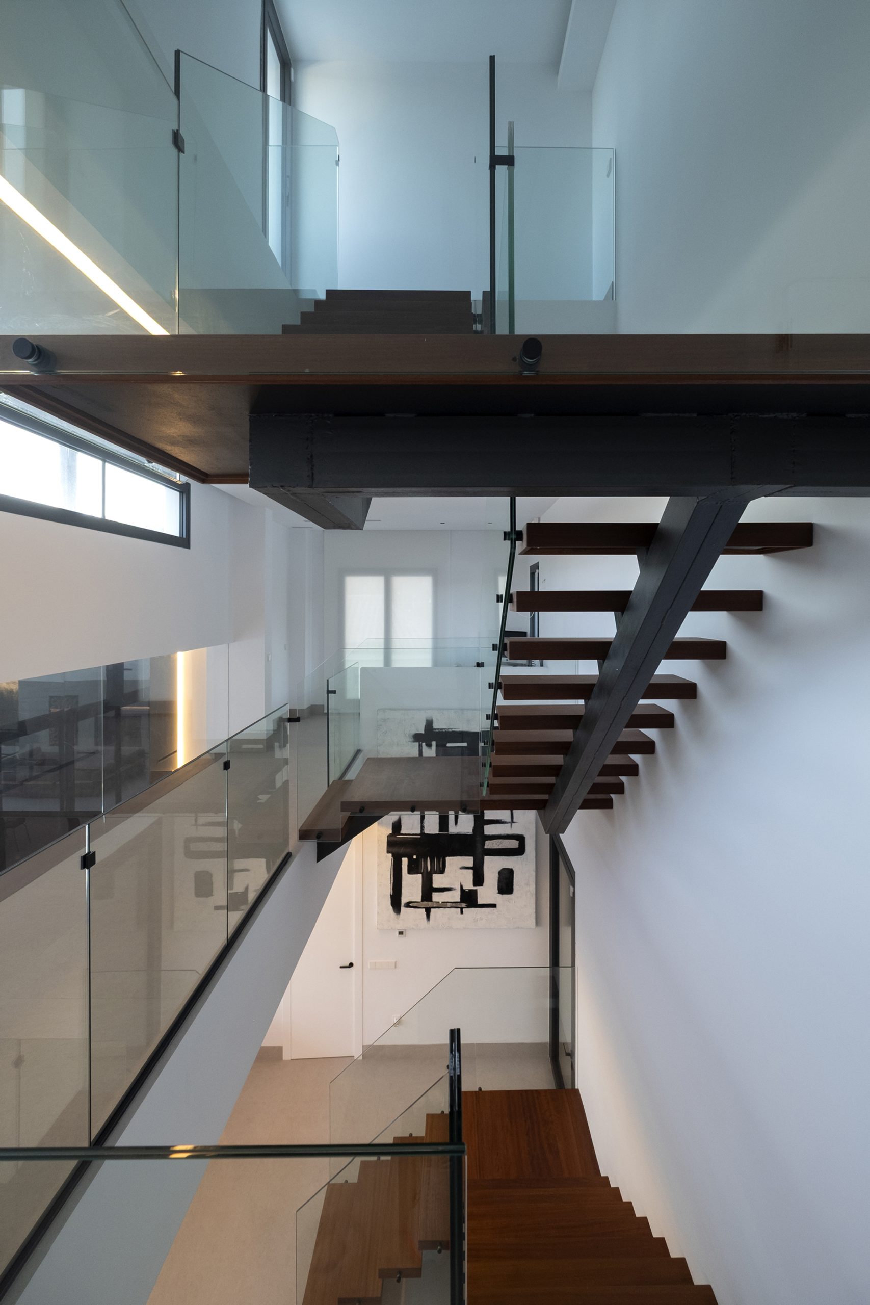 En la planta primera se ubica el dormitorio principal, al que se accede desde un vestíbulo, configurado como un espacio abierto. Desde aquí se establecen visuales en diagonal hacia el salón y el exterior, a través de un ventanal longitudinal que recorre todo el distribuidor. En el lateral opuesto al dormitorio principal se dispone una zona de trabajo, nuevamente orientada hacia el patio.