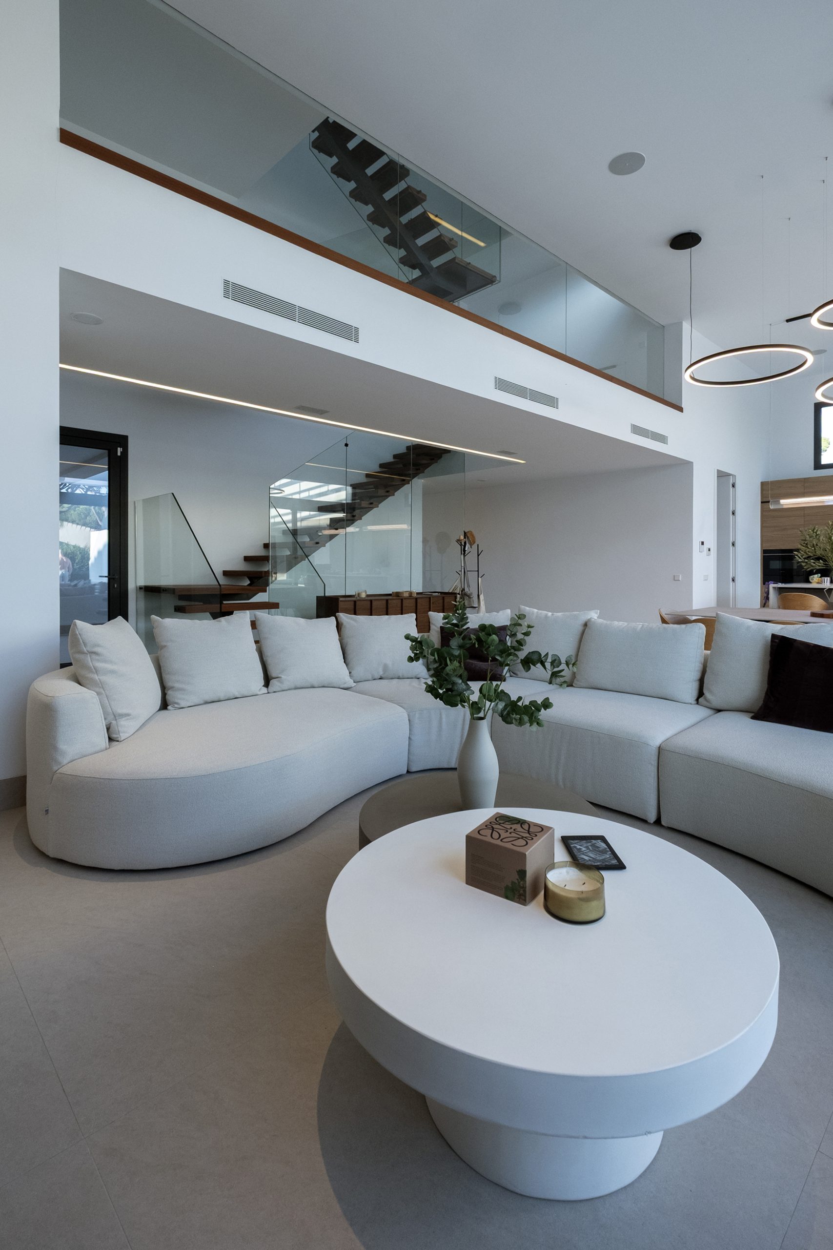 El patio actúa como regulador bioclimático, favoreciendo la ventilación natural cruzada en todas las estancias y mejorando la calidad del aire y el rendimiento térmico. La escalera que culmina en el castillete funciona como chimenea natural, impulsando la ventilación vertical, y este punto se consolida como mirador con vistas al pinar.