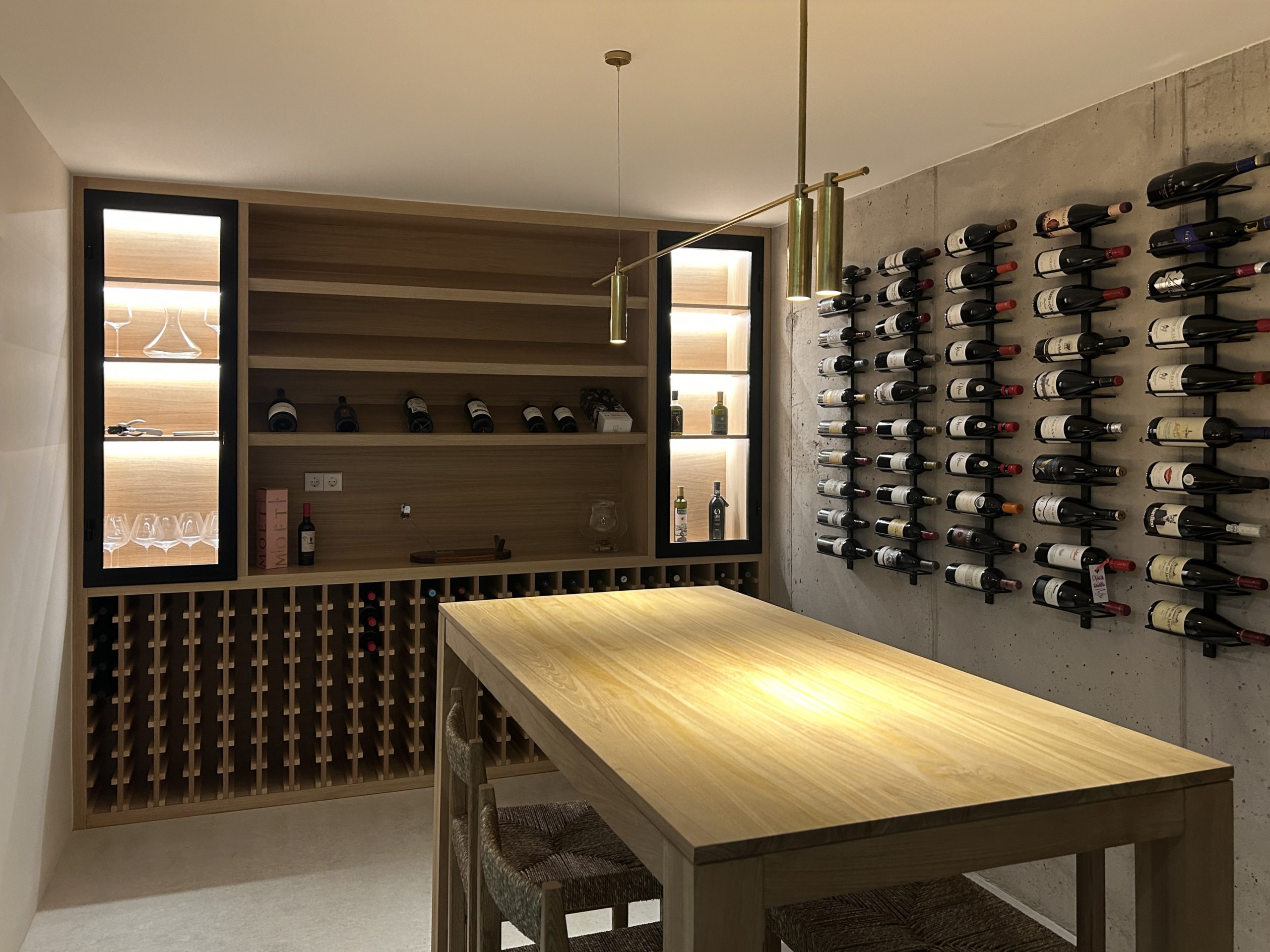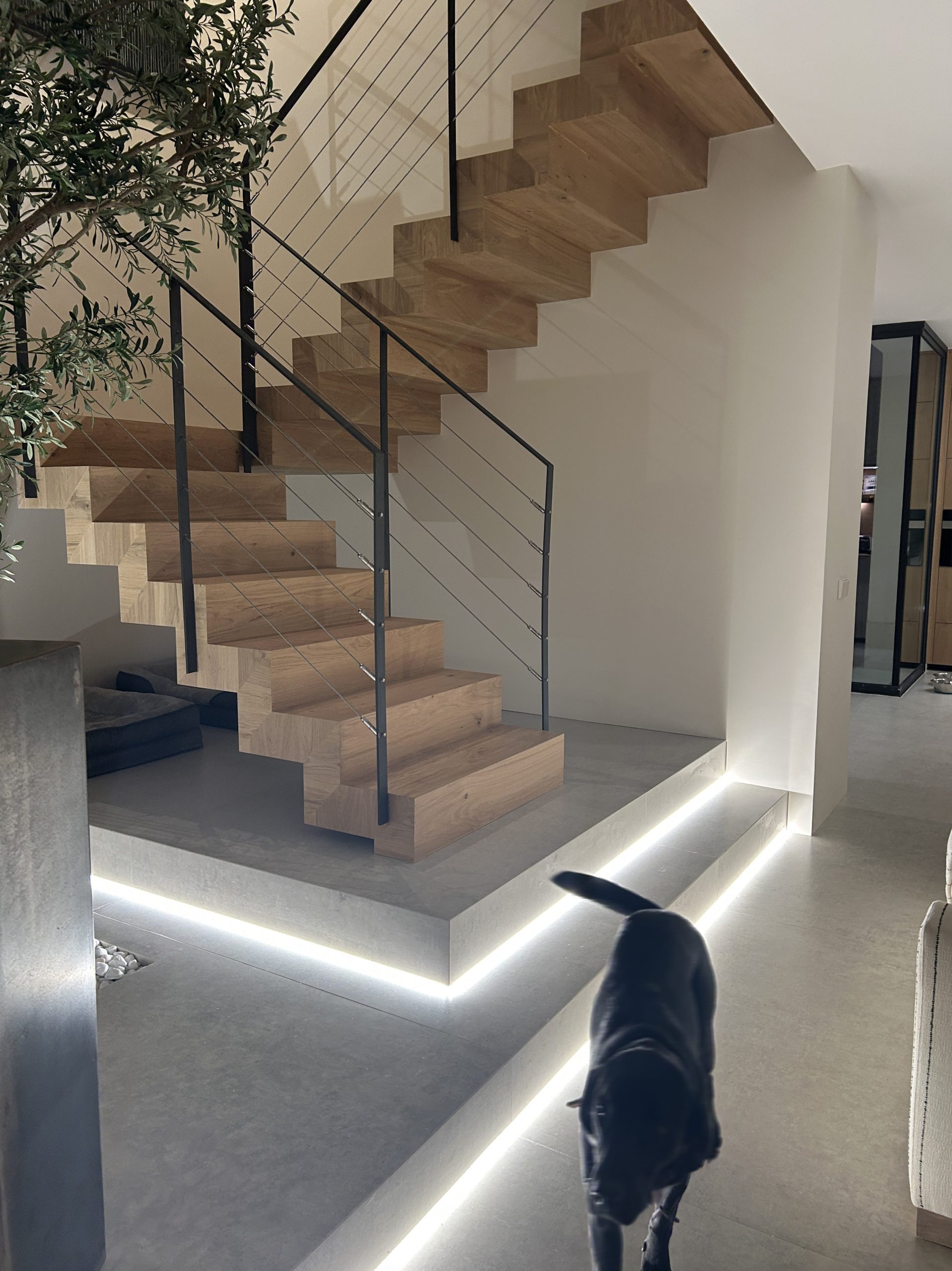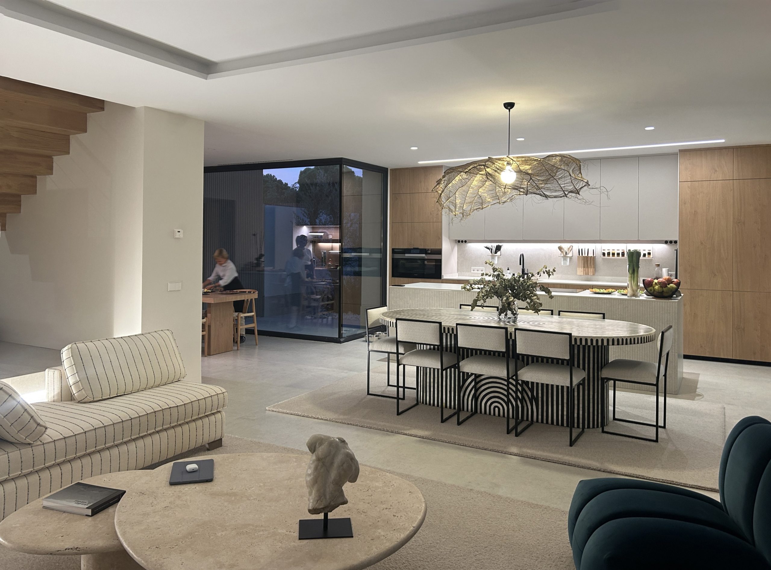 La organización interior se articula en torno a una escalera de madera en un espacio a doble altura, iluminado por un gran ventanal norte que aporta luz suave y constante, destacando su carácter ligero. Más que un elemento de circulación, la escalera estructura el espacio, relaciona los niveles y conecta visualmente salón y planta superior, aportando calidez frente a la geometría limpia. En el sótano, un patio inglés con lamas de madera regula la entrada de luz al gimnasio y la bodega, controla la iluminación y aporta privacidad sin perder conexión con el exterior.