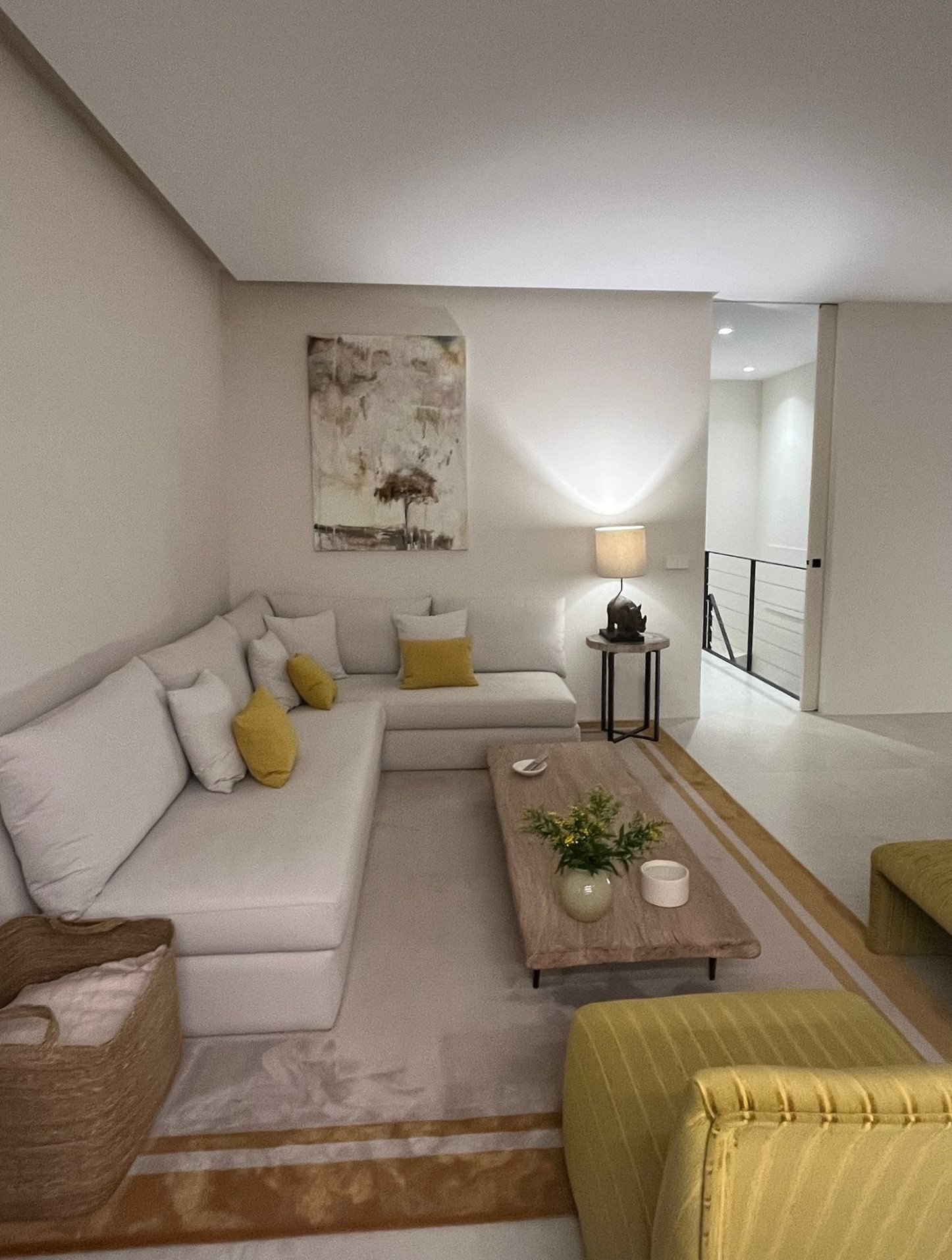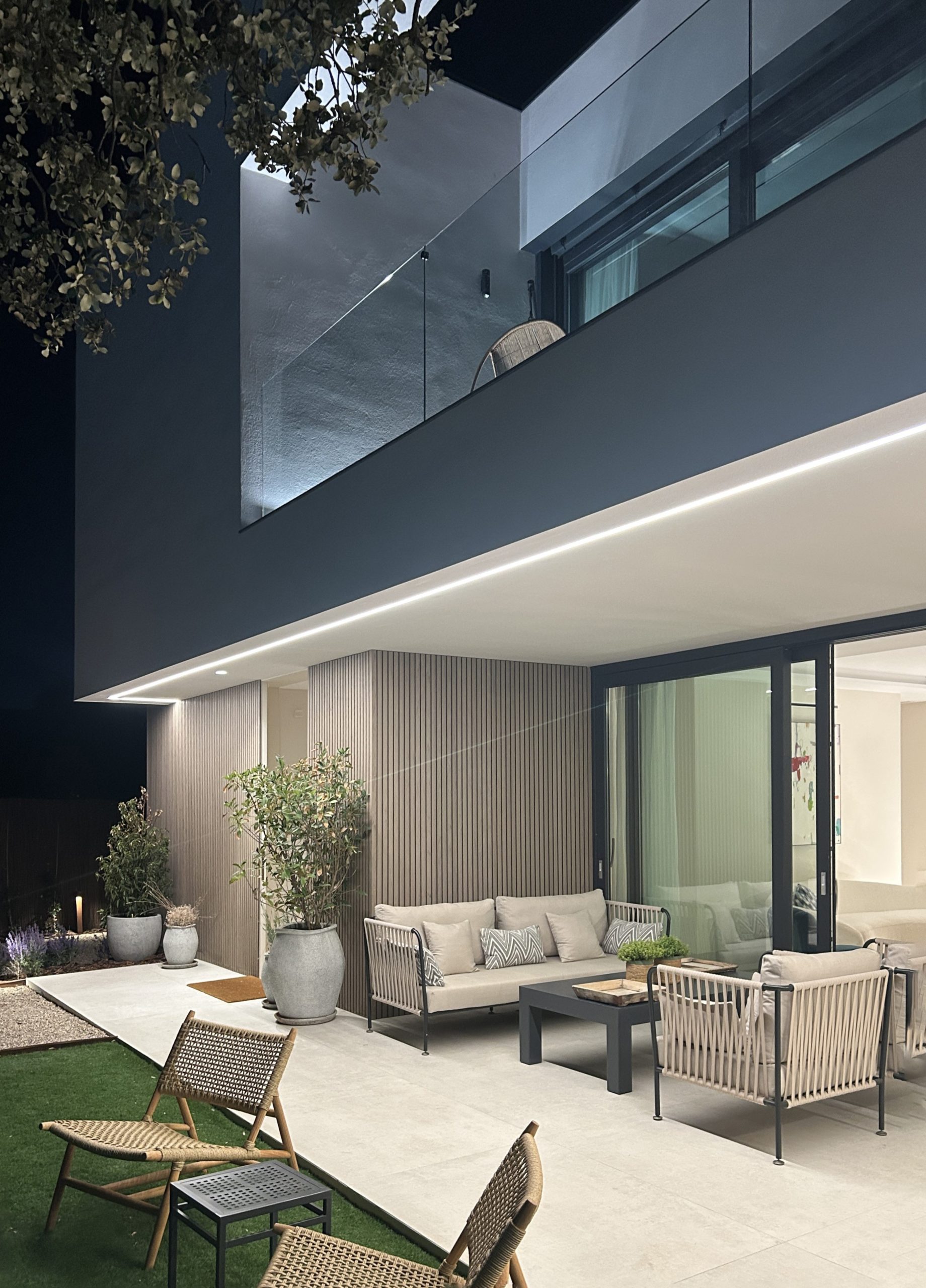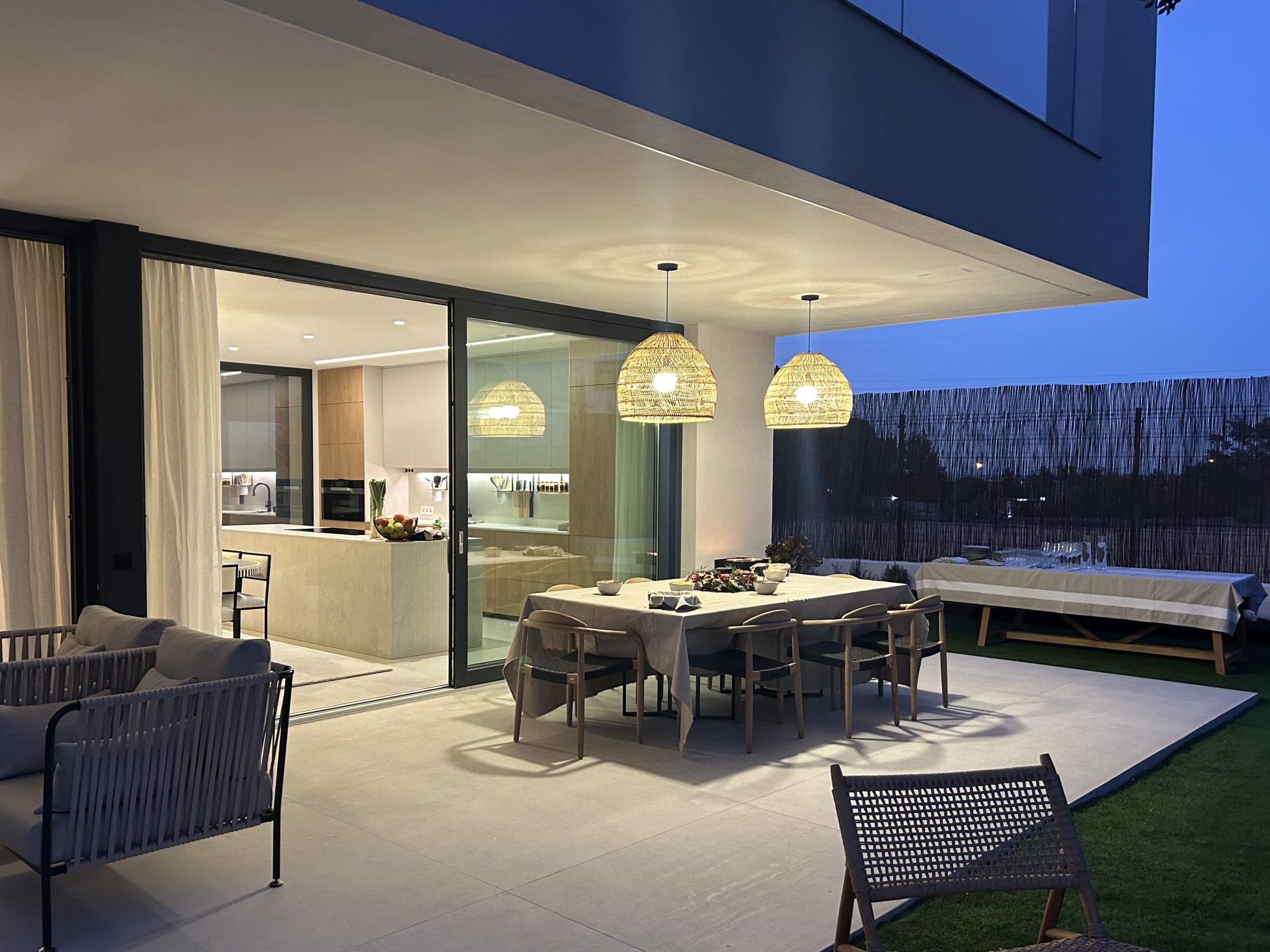 En planta alta, los dormitorios se orientan para optimizar la luz solar. El volumen superior se proyecta sobre el salón generando un porche que prolonga visualmente la zona de estar hacia la piscina. La fragmentación volumétrica responde a criterios funcionales y climáticos: el dormitorio principal se abre a una terraza íntima, mientras los demás se orientan al suroeste. El porche actúa como extensión protegida del salón, proporcionando sombra y transición fluida entre interior y exterior. La composición se define por el contraste entre el blanco y la madera, que aporta calidez y ritmo.
