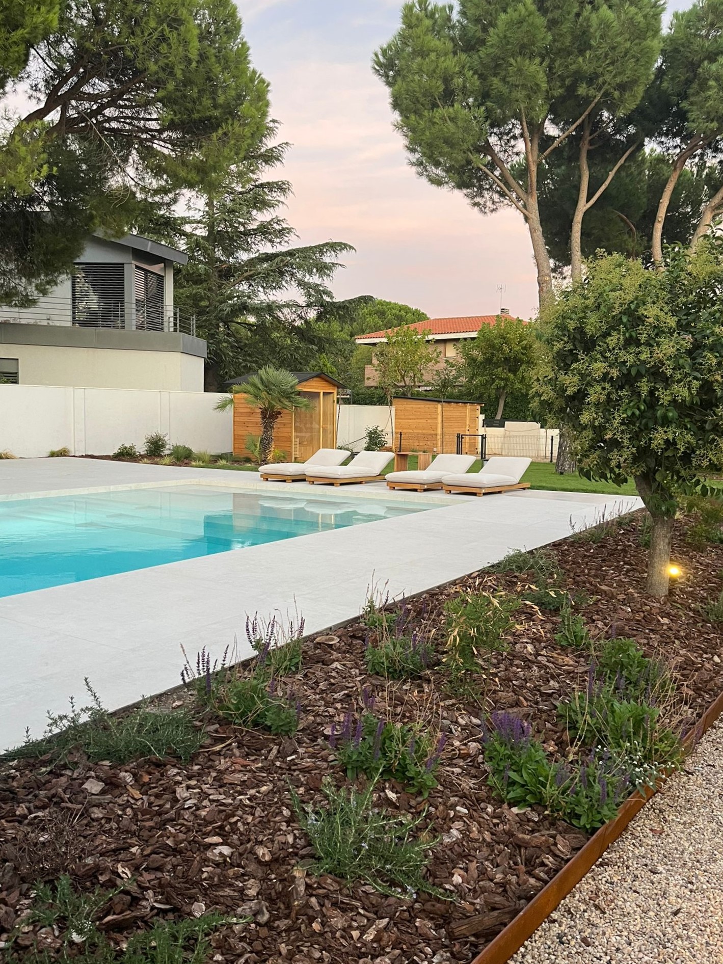 Ubicada en la presierra de Madrid, la vivienda se inserta entre pinos y encinas buscando un diálogo sereno con el paisaje. Su implantación responde a la voluntad de integrar las estancias principales en el entorno: se conserva el único olivo como pieza central de un patio vinculado al espacio principal, y desde el porche la encina proyecta sombra sobre la terraza del dormitorio, incorporando la naturaleza a la vida cotidiana.