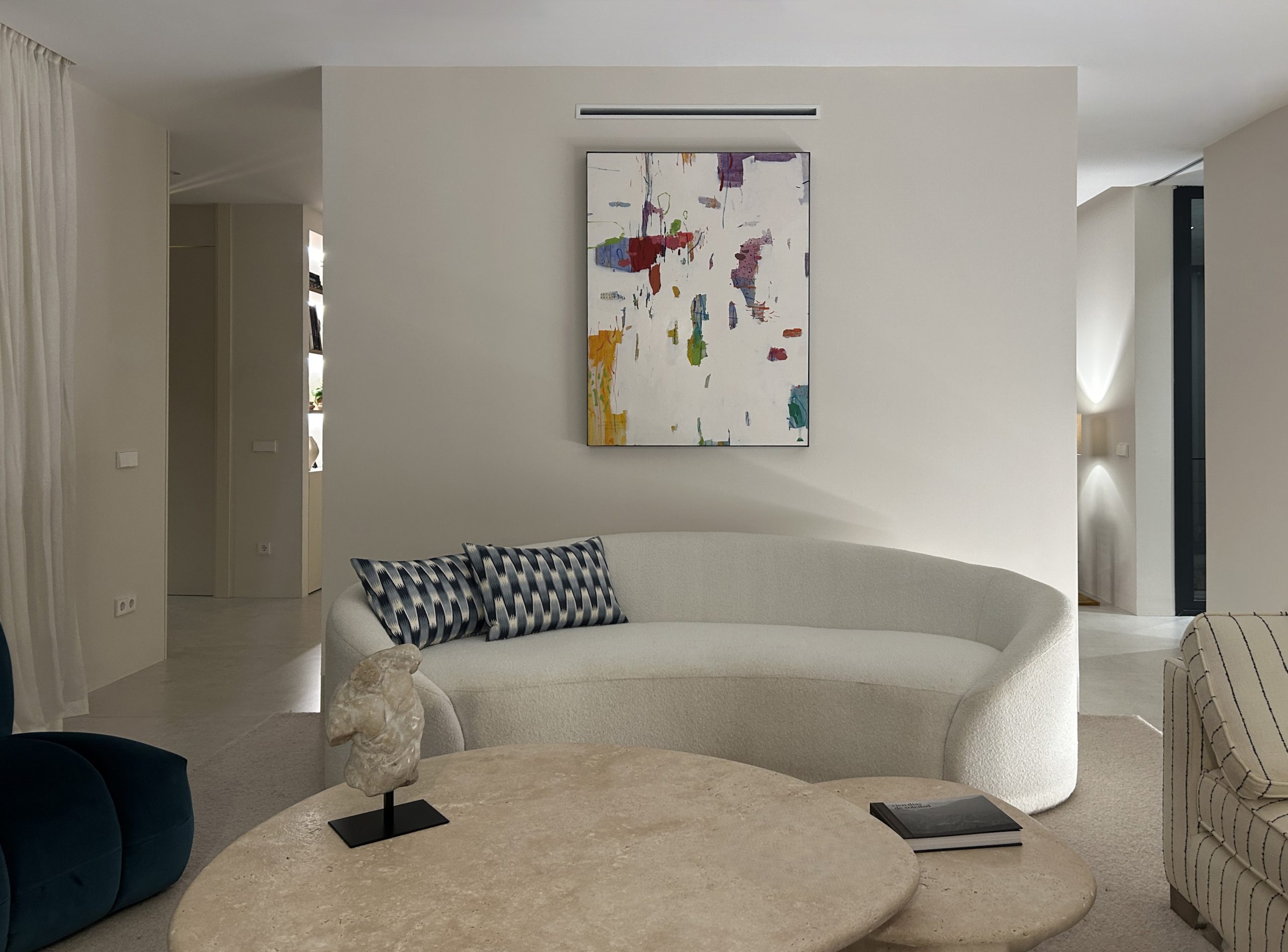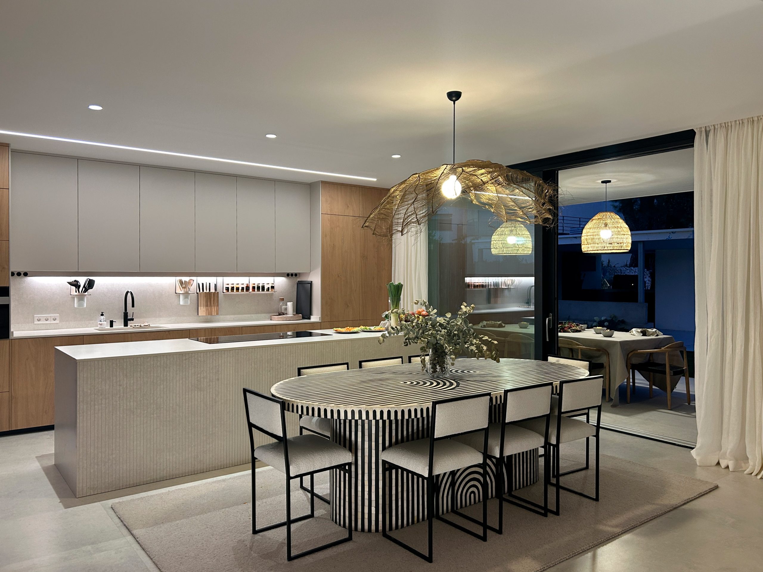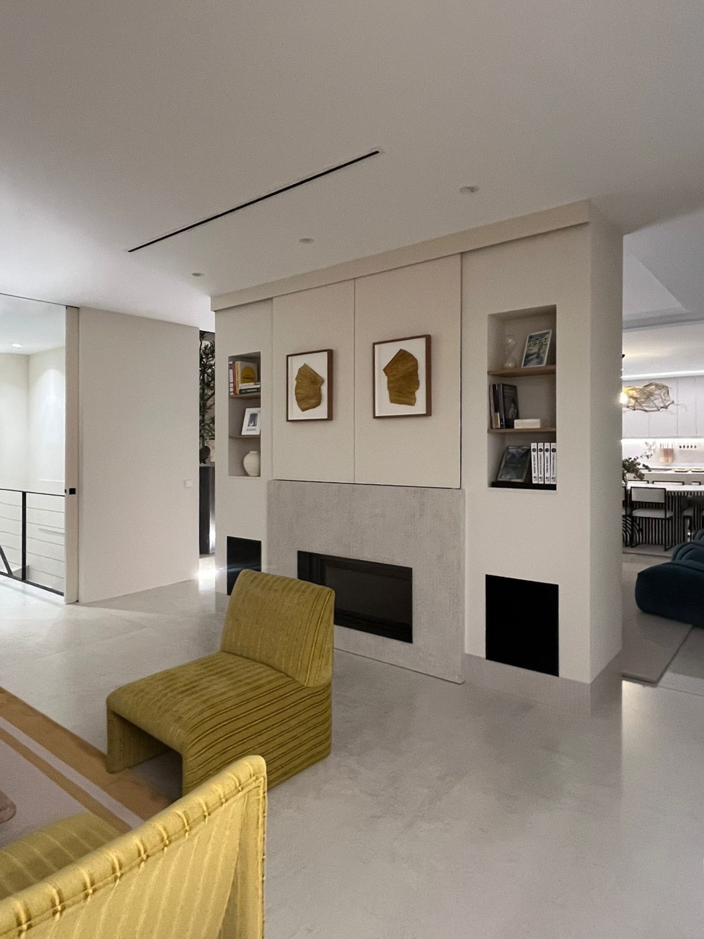 El mueble de chimenea, diseñado a medida, funciona como pieza central del espacio principal: integra chimenea y televisión, y a la vez filtra y separa salón y comedor sin cerrar el espacio, manteniendo la coherencia formal del proyecto basada en geometría limpia, materiales cálidos y proporción cuidada.