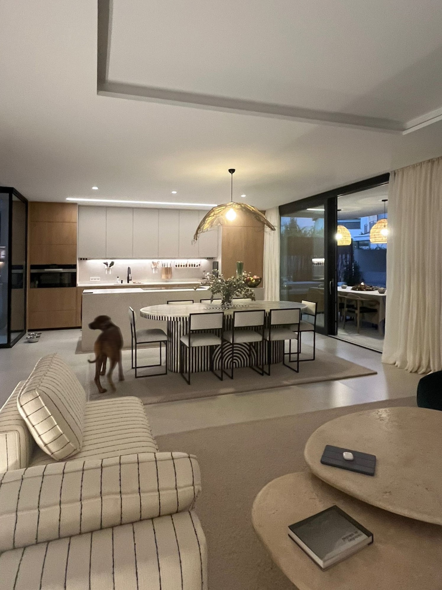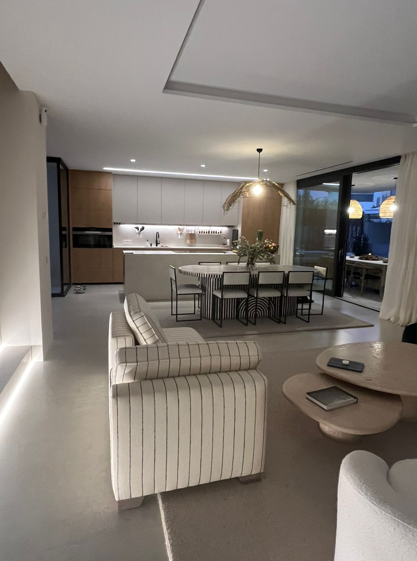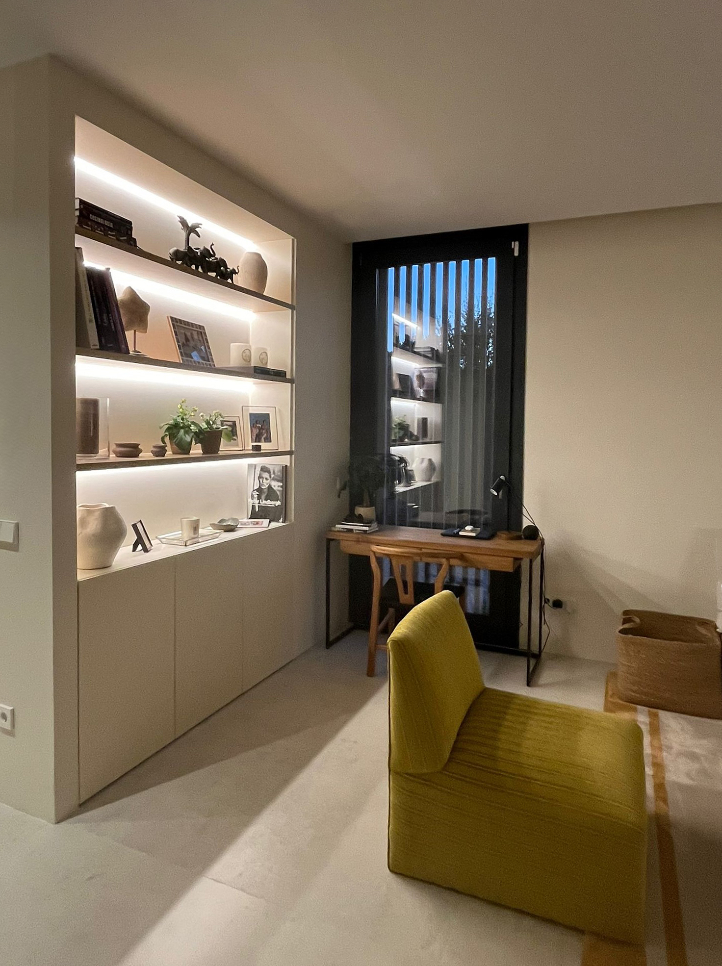 El mueble de chimenea, diseñado a medida, funciona como pieza central del espacio principal: integra chimenea y televisión, y a la vez filtra y separa salón y comedor sin cerrar el espacio, manteniendo la coherencia formal del proyecto basada en geometría limpia, materiales cálidos y proporción cuidada.