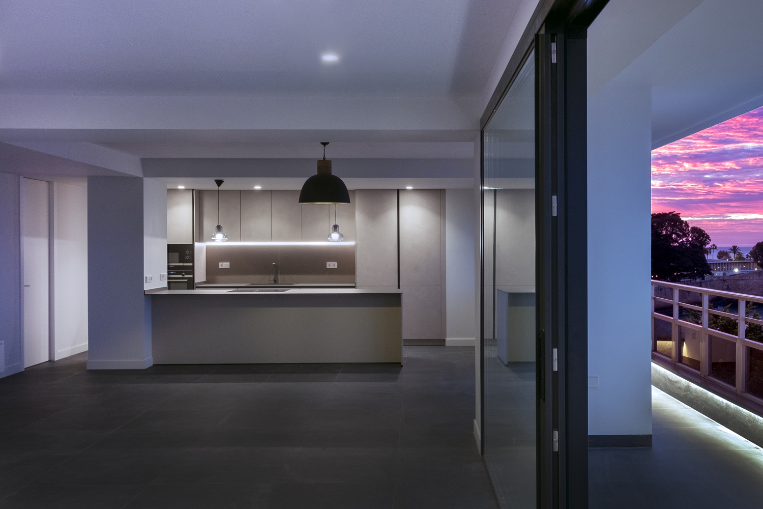 La vivienda, situada en una de las “modernas torres vigía”, construidas en los años 70 que se asoman a la Alameda, ha sido reformada completamente. Amplios espacios diáfanos y versátiles, así como conseguir mayores superficies de vistas hacia la Bahía, fueron objetivos buscados desde el principio.